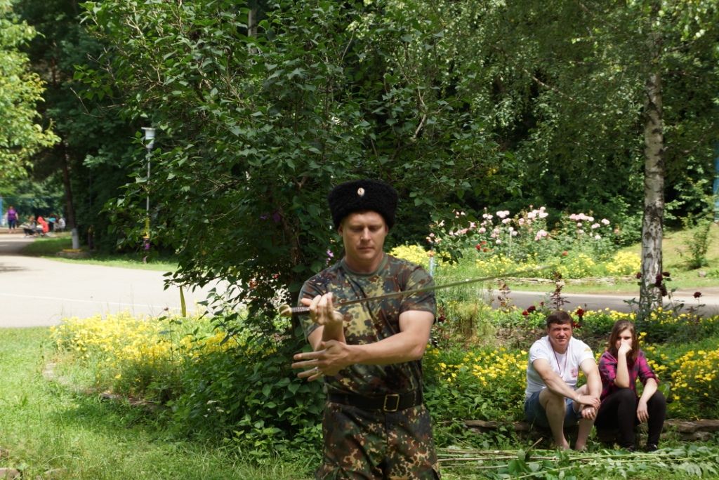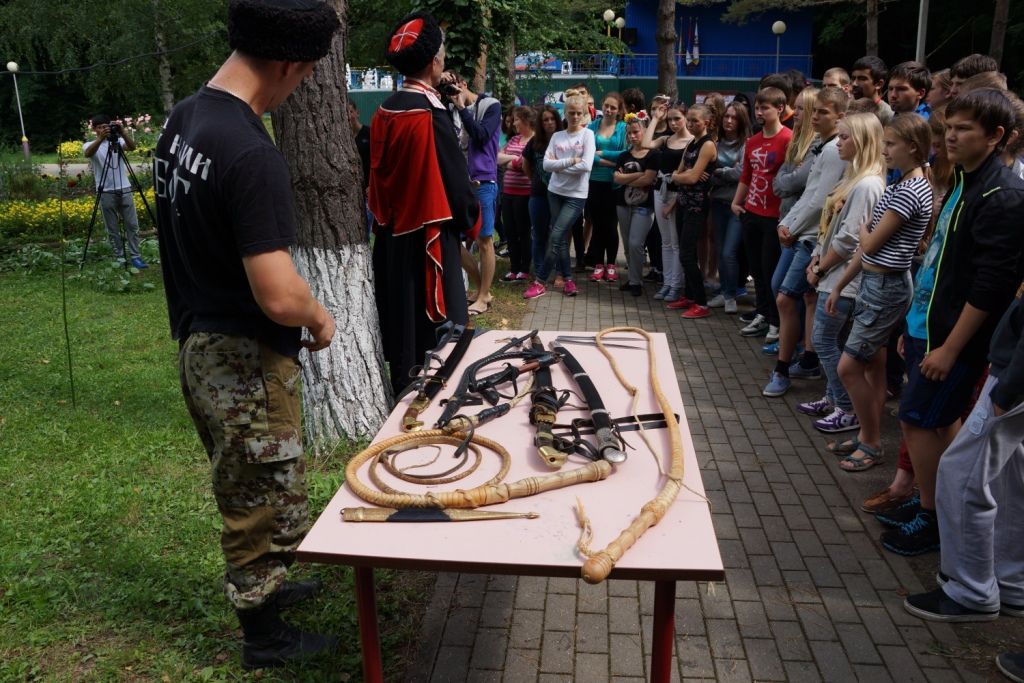Затем казаки из охраны подворья митрополита Екатеринодарского и Кубанского Исидора: хорунжий Игорь Гуров, хорунжий Алексей Глущенко и старший вахмистр Тимофей Шевченко рассказали о холодном оружии казаков и показали на практике приемы владения кинжалом, шашкой, нагайкой и арапником.