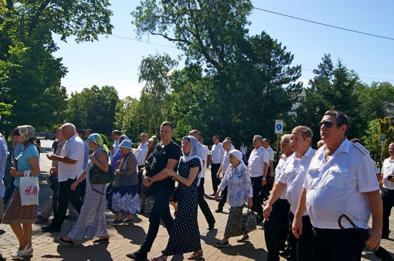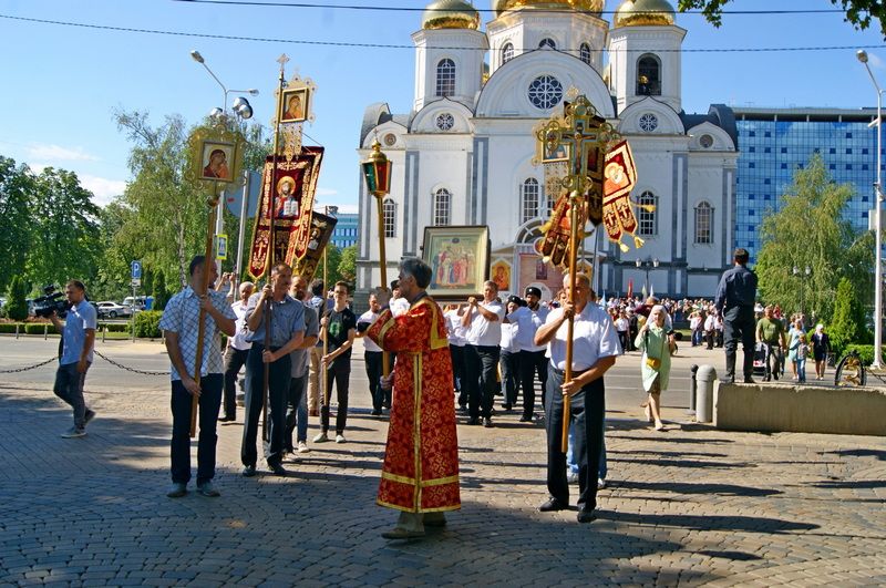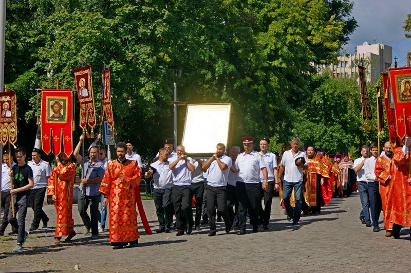 После литургии в 09.30 колонна направилась от войскового Собора святого благоверного князя Александра Невского по улице Красной до храма-часовни Александра Невского в сквере имени Георгия Жукова, где состоялся молебен.