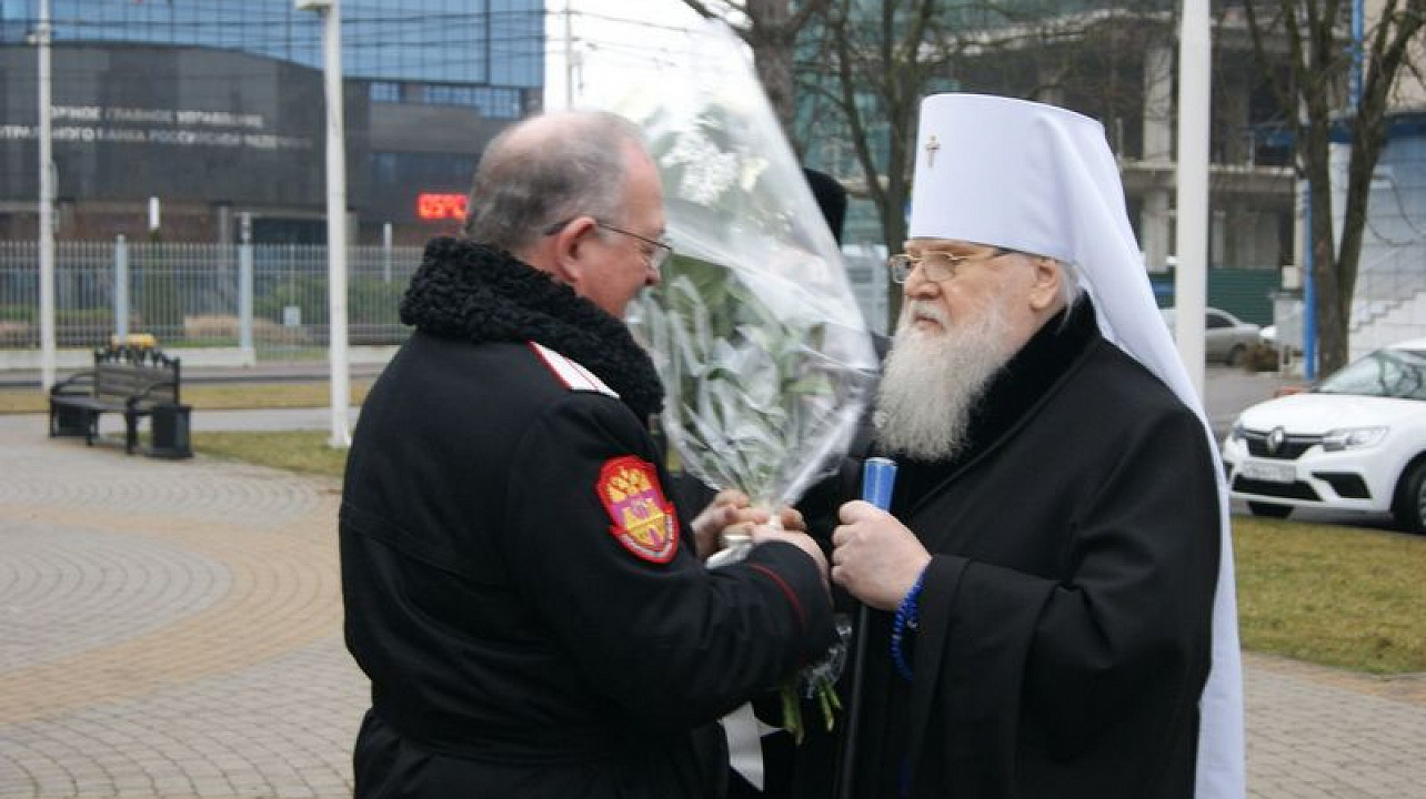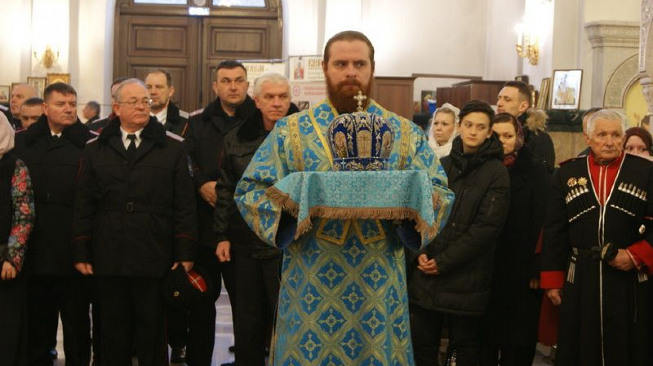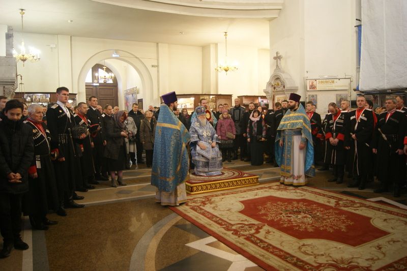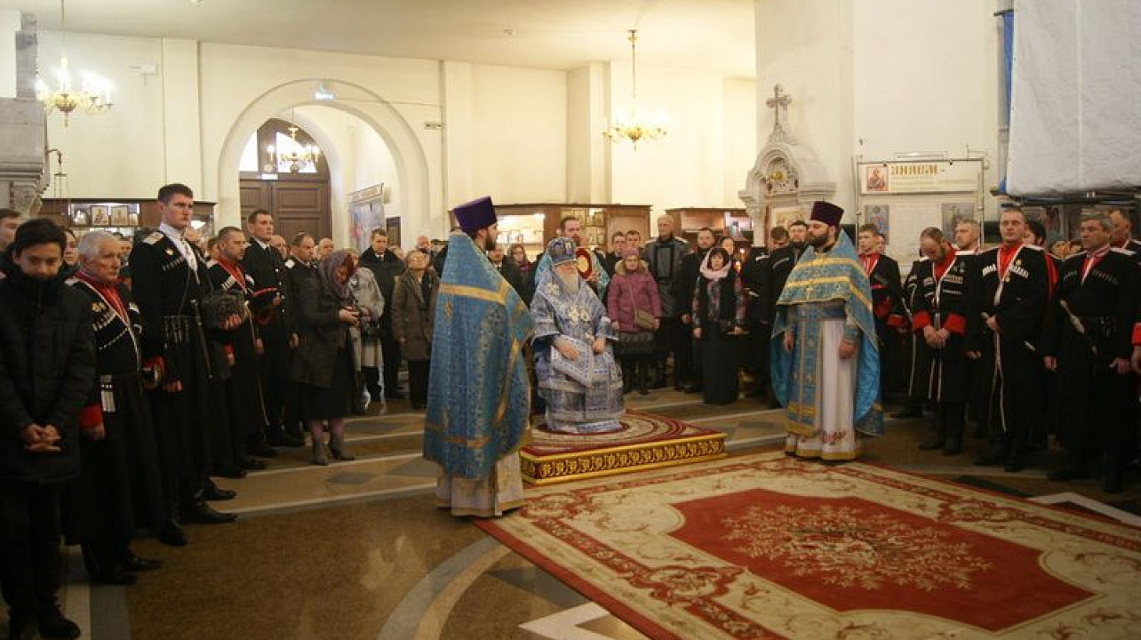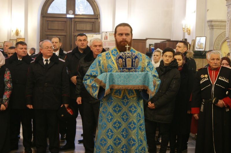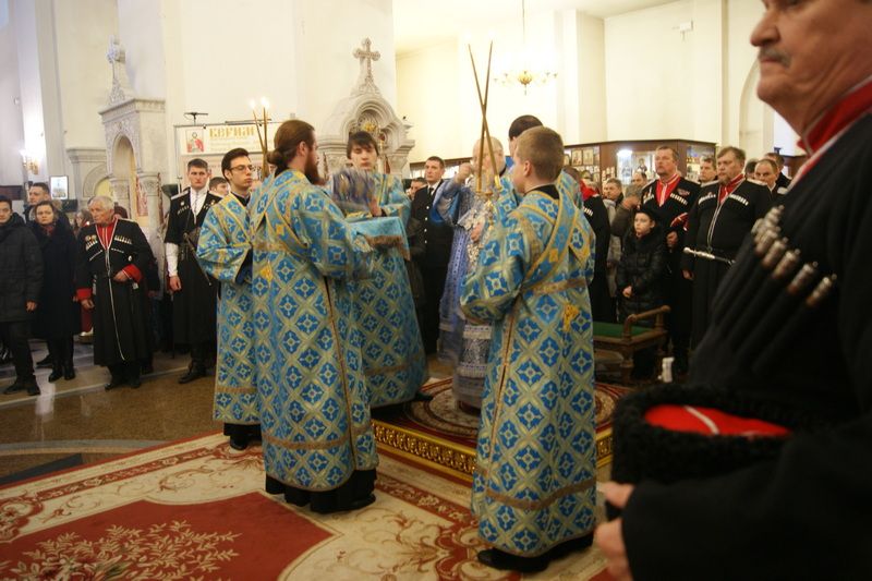Богослужение возглавил Митрополит Екатеринодарский и Кубанский Исидор в сослужении настоятеля Собора, духовника Кубанского казачьего войска протоиерея Ионна Гормаш и священнослужителей Собора.