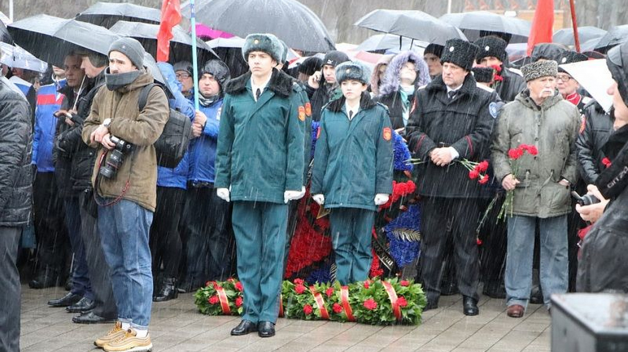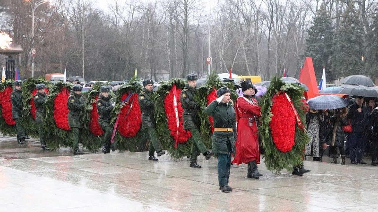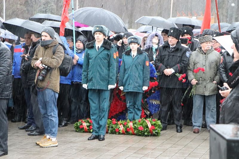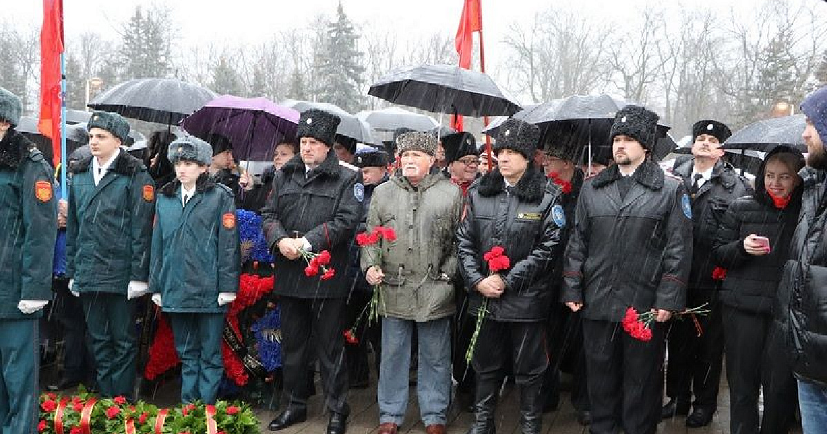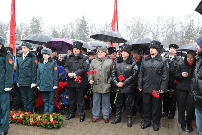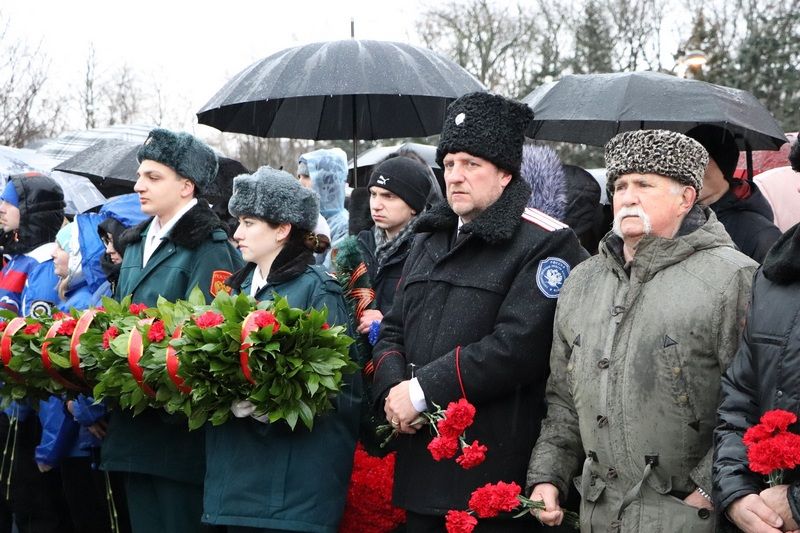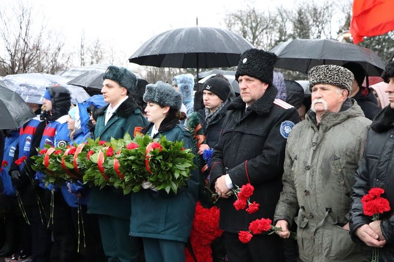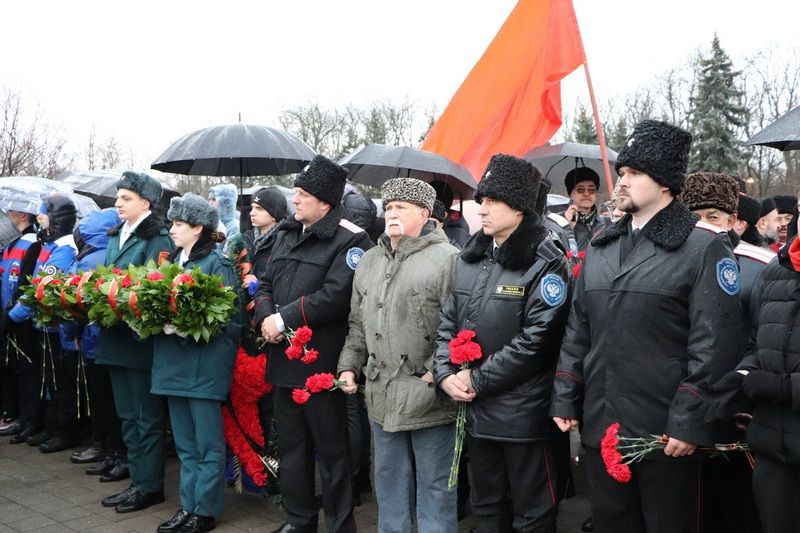 Несмотря на непогоду отдать дань памяти освободителям Краснодара от немецко-фашистских захватчиков к мемориалу пришли более тысячи человек. У многих в этой братской могиле остались лежать те, кто защищал город от врага.