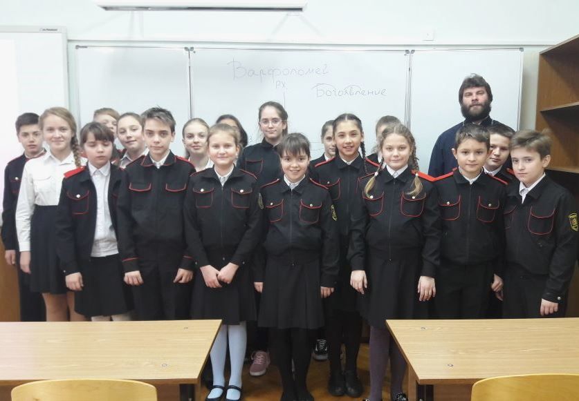 17 января в гимназии №3 города Краснодара штатный священник Свято-Сергиевского храма протоиерей Иоанн Воронов провёл беседу с казачьей молодёжью 5-го «К» класса казачьей направленности.