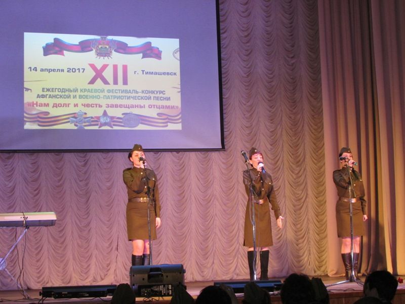 19 апреля 201714 апреля 2017г. в городе Тимашевск по инициативе Краснодарской региональной организации Общероссийской общественной организации «РОССИЙСКИЙ СОЮЗ ВЕТЕРАНОВ АФГАНИСТАНА», Краснодарского городского отделения Краснодарской региональной организации Общероссийской общественной организации «Российский Союз ветеранов Афганистана» при поддержке Министерства культуры Краснодарского края, краевого учебно-методического центра культуры администрации муниципального образования Тимашевского района, прошел ежегодный краевой фестиваль-конкурс Афганской и военно-патриотической песни «Нам долг и честь завещаны отцами».