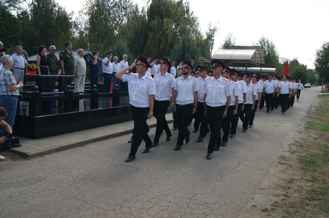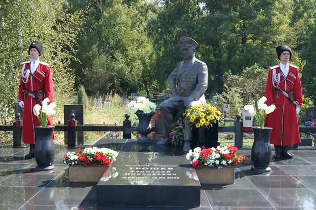 Казаки Екатеринодарского районного казачьего общества возложили цветы к могиле Трошева, после чего вместе с военнослужащими Краснодарского гарнизона прошли торжественным строем.