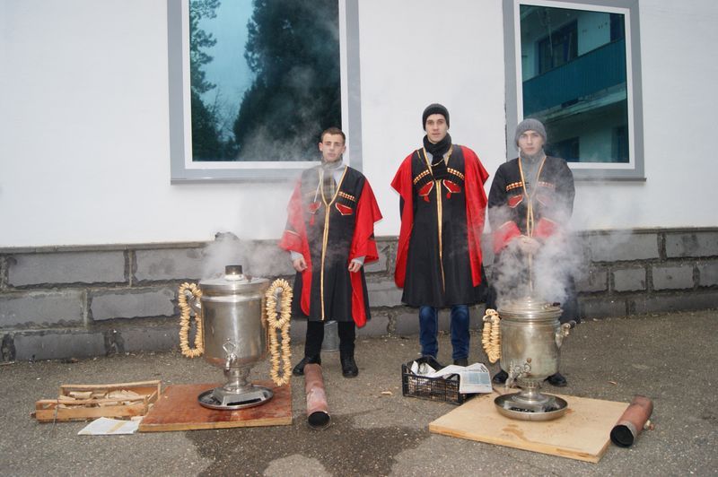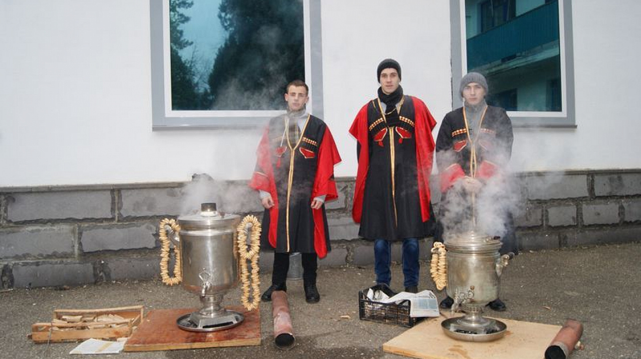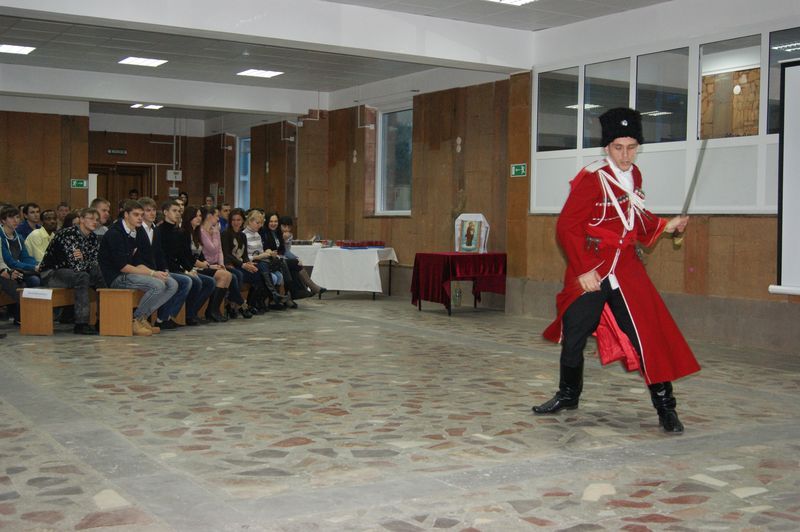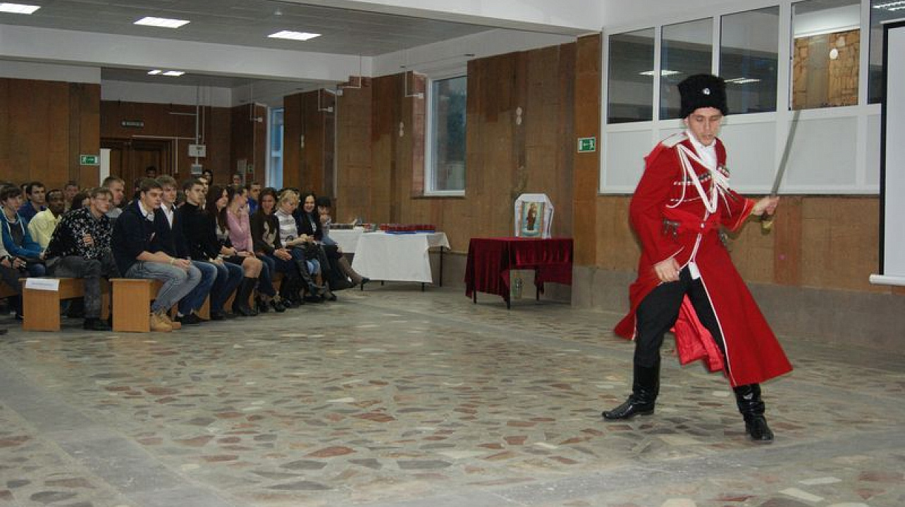 Студенты подготовили доклад об истории Кубани и казачьих традициях. Казачий полковник Павел Фролов обратился с приветственным словом к студентам и вручил им книгу "Казачья доля", автором которой он является. Казаки почетного караула показали свое искусство филигранного владения холодным оружием. Студенты с замиранием сердца наблюдали за происходящим.