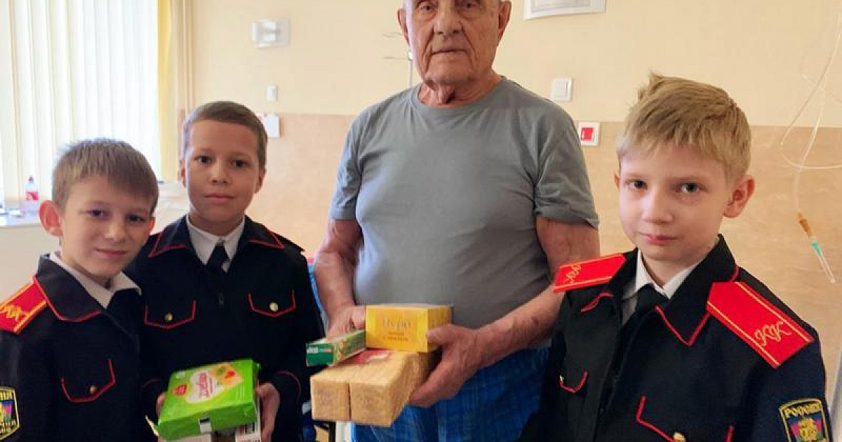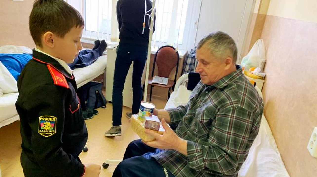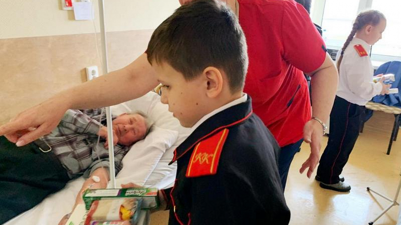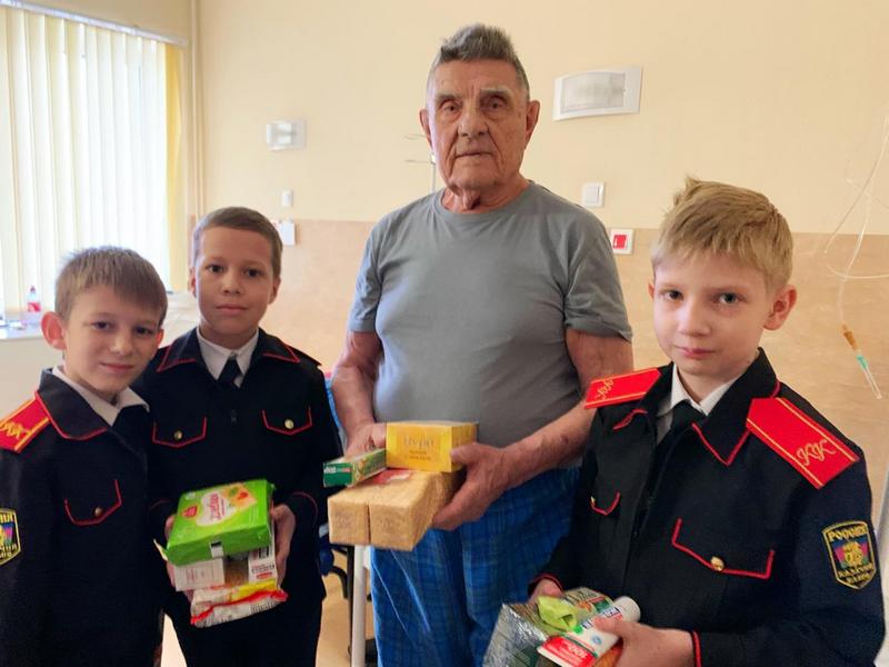 Ребят из школы привел казак-наставник Екатеринодарского районного казачьего общества из хуторского казачьего общества «Суворовский Редут» Андрей Артюхов. Вместе с позитивными эмоциями и словами благодарности казачата принесли ветеранам сухпаек, который собирали сами всем классом. Также передали письма с поздравлениями от своих одноклассников, которые не смогли прийти.