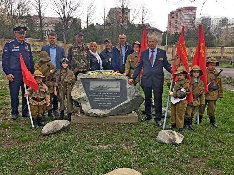 Открытие Памятного знака «Вертолет Ми-6 героям Воинам-афганцам» состоялось 9 мая 1987 годак празднованию дня Победы Советского народа в Великой Отечественной войне 1941-1945гг. В перестроечные 90-е годы вертолёт был сожжён вандалами, но память о «Вертолётной площадке» осталась в сердцах жителей ЮМР. По многочисленным просьбам жителей района была создана инициативная группа для возрождения «Вертолетной площадки» (собрано 2037 подписей жителей), после 3х лет плодотворной работы совместно с депутатами ЗСК, администрацией города и Западного округа, а так же депутатами городской Думы, ветеранами «Российского Союза ветеранов Афганистана» и общественным советом ЮМР удалось восстановить «Вертолетную площадку» в обновленном виде. На производство этих работ были выделены средства депутатом ЗСК Тутаришевым Б.З., депутатами городской Думы Нехай А.Ю. и Летучей Т.Б. Особую благодарность выражают ветераны и жители Юбилейного района подрядчику ООО «ВЕГАГРУПП-ЮФО» и лично генеральному директору Вовк А.С. за качественное выполнение работ. Вертолётная площадка стала популярным местом для всех жителей микрорайона и города. В данном проекте удалось сохранить историческую память о всех ветеранах локальных воин. Мероприятие проведено с соблюдением требований Роспотребнадзора.