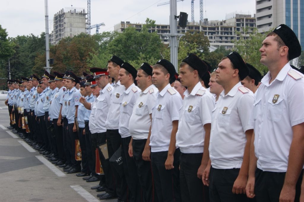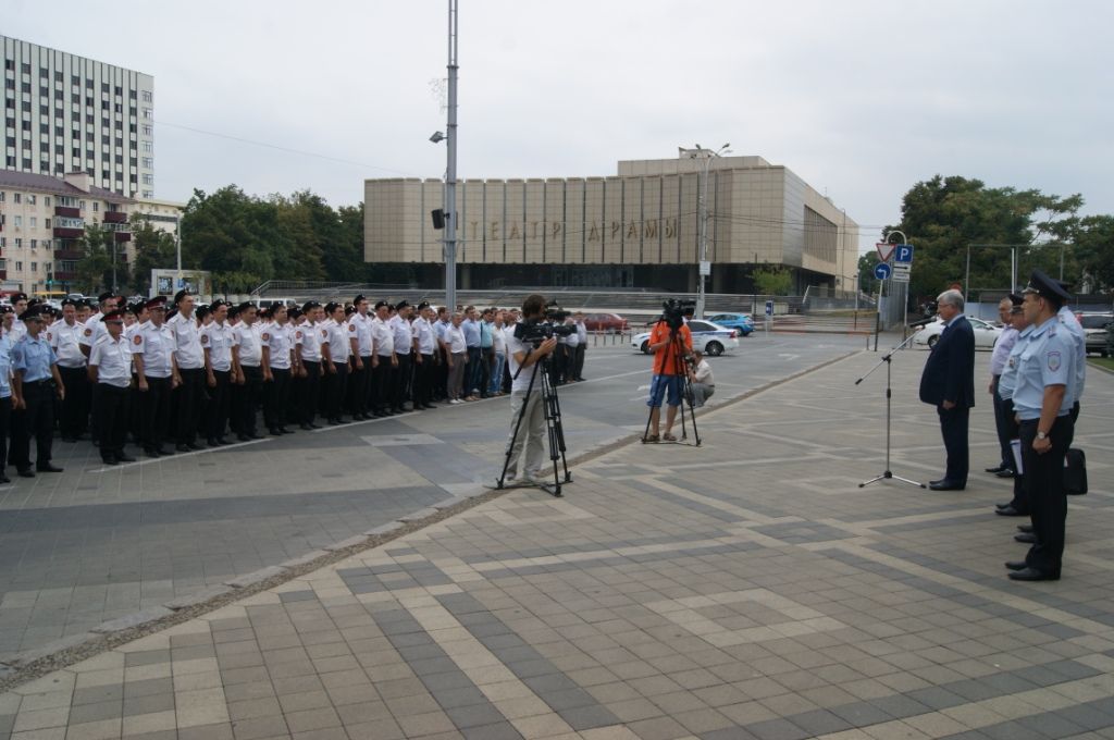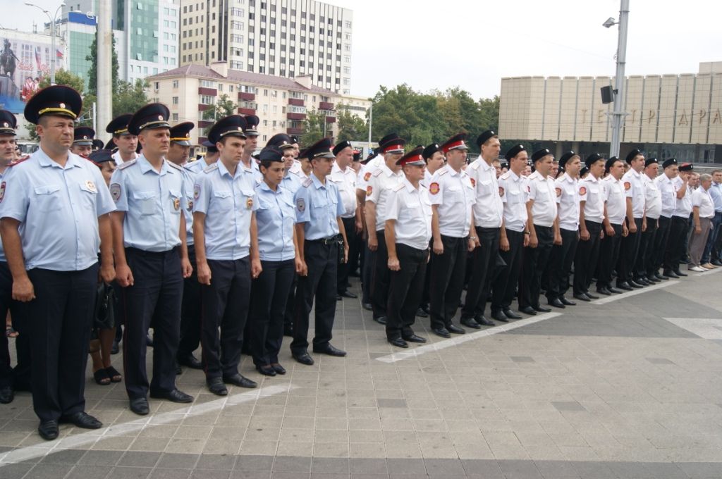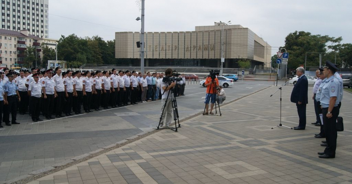 На Театральной площади города Краснодара прошёл развод с участием сотрудников полиции, казаков — дружинников Екатеринодарского районного казачьего общества и сотрудников администрации.