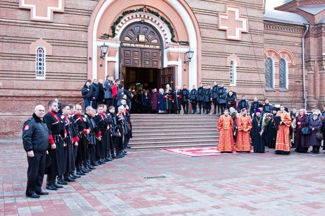 Казаки Екатеринодарского районного казачьего общества во главе с атаманом, казачьим полковником Александром Пащенко традиционно встретили Митрополита у входа в храм.