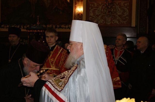 В завершении Богослужения заместитель атамана Кубанского казачьего войска, войсковой старшина Константин Перенижко, вручил Владыке цветы, пожелав божьей помощи и долгих лет жизни.