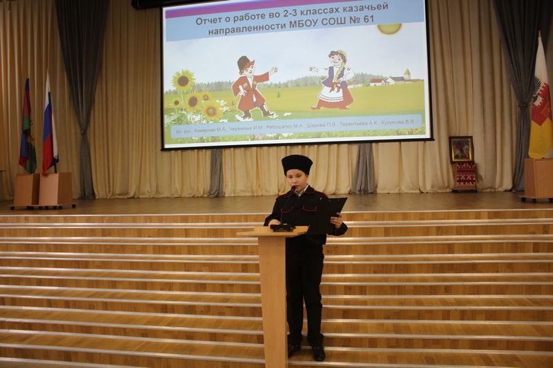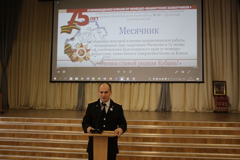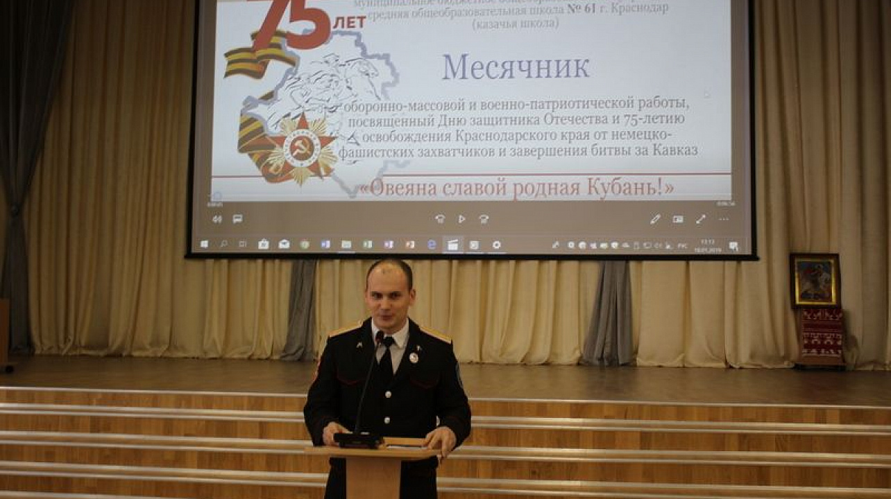 В преддверии месячника военно-патриотической работы атаманы 61 школы созвали совет. На совете юные атаманы обсудили планы на месячник, наметили объем и направление работы. Так же на совет были приглашены учителя, казаки хуторского казачьего общества «Курень Каширинский» и председатель краснодарского отделения Союза казачьей молодёжи Кубани.