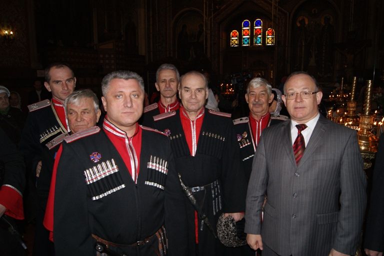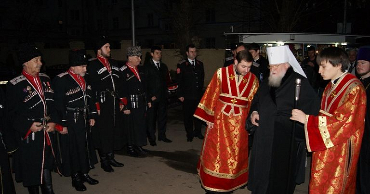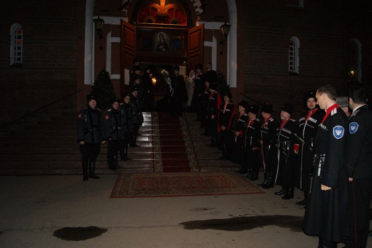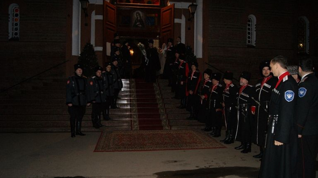 Казаки Екатеринодарского районного казачьего общества во главе с атаманом, казачьим полковником Александром Пащенко традиционно встретили Митрополита у входа в храм.