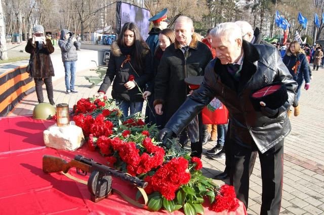 После минуты молчания в память о погибших в годы Великой Отечественной войны и церемонии возложения цветов, торжественным маршем прошли казаки Екатеринодарского районного казачьего общества, военнослужащие Краснодарского гарнизона, казаки, курсанты Краснодарского университета МВД и курсанты Краснодарского Президентского кадетского училища.