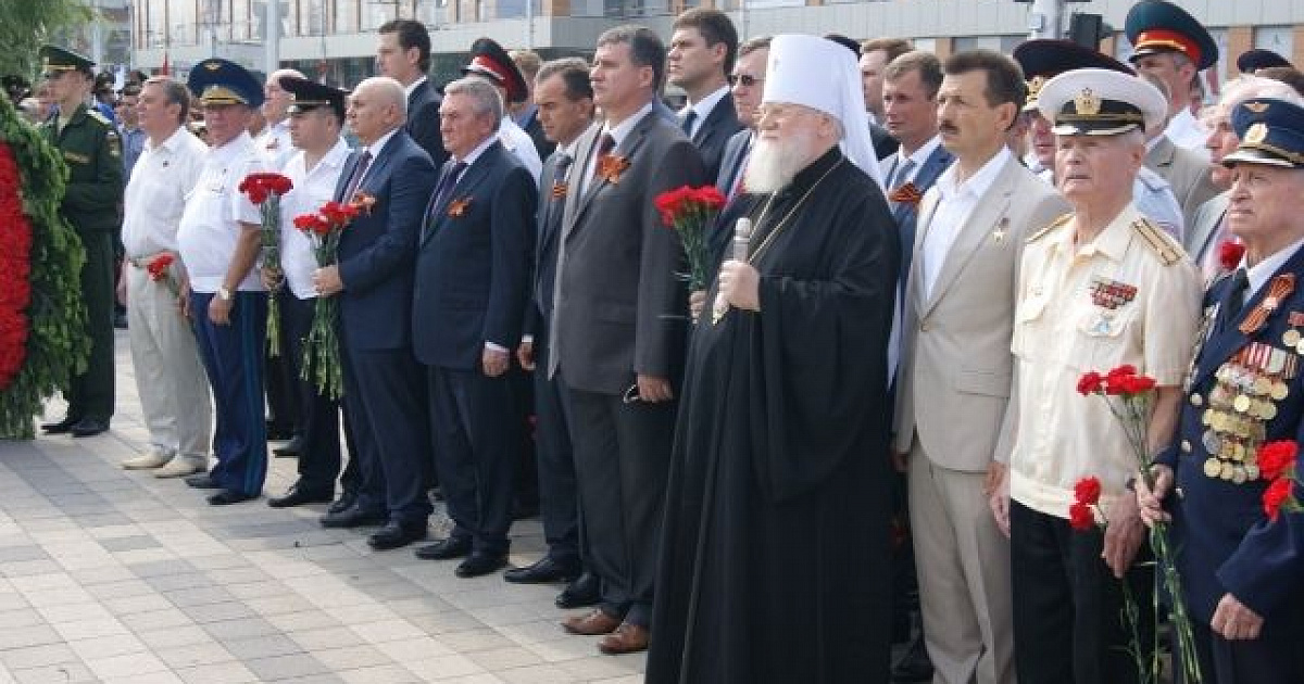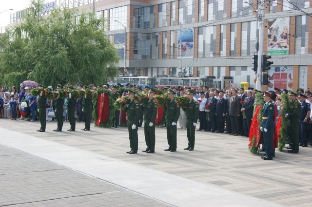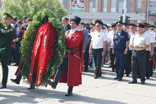 Сотни краснодарцев пришли утром к Вечному огню на площади Памяти Героев, чтобы возложить цветы и венки к мемориалу, почтить память погибших в годы Великой Отечественной войны.