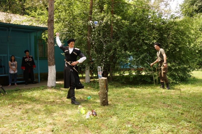 Затем командир дружины хуторского казачьего общества «Ореховатое» старший вахмистр Александр Агибалов, показал приёмы самообороны от холодного и огнестрельного оружия, а сотник Михаил Кульбашный и младший урядник Иван Кузьмин продемонстрировали приёмы владения шашкой, нагайкой и арапником, мастерски разрубая лозу и бутылки с водой. После показательного выступления каждый из ребят смог задать вопросы гостям и сделать фото на память.