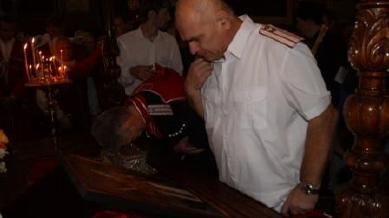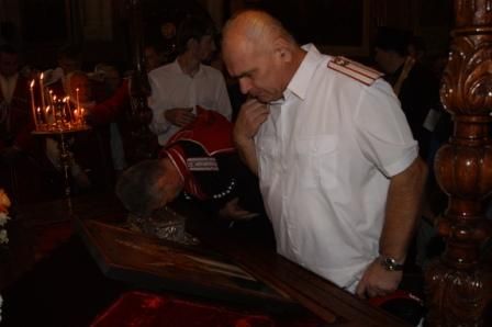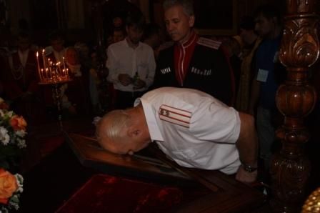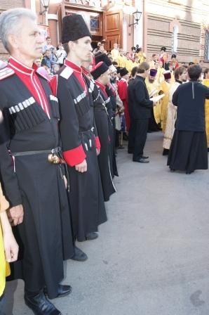 Казаки Екатеринодарского районного казачьего общества во главе с атаманом казачьим полковником Александром Пащенко встретили ковчег со святыми мощами у входа в храм, после чего участвовали в торжественном богослужении. На протяжении всего времени пребывания мощей в Свято – Екатерининском соборе два казака несли службу внутри храма у мощей и три наряда дружинников казачьей дружины - по периметру храма.