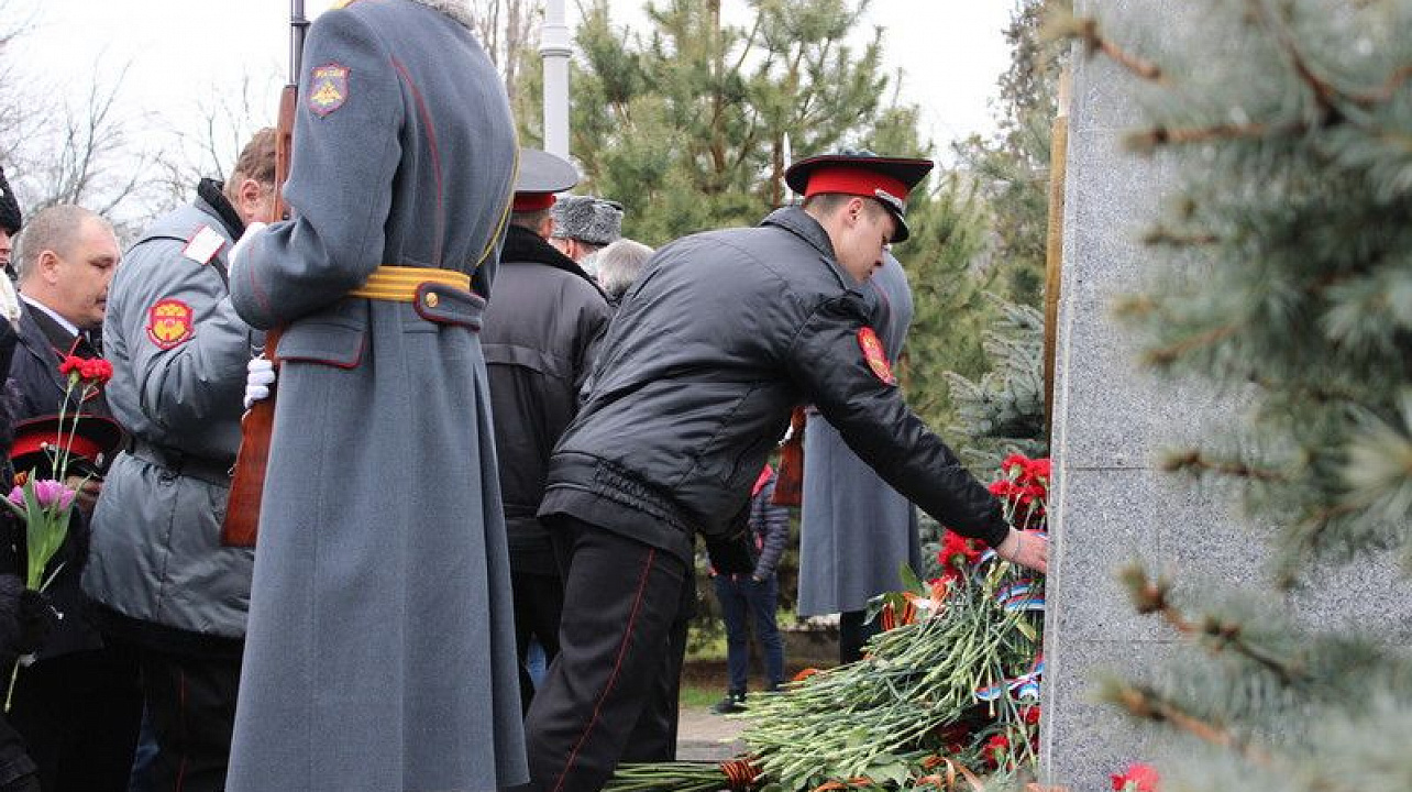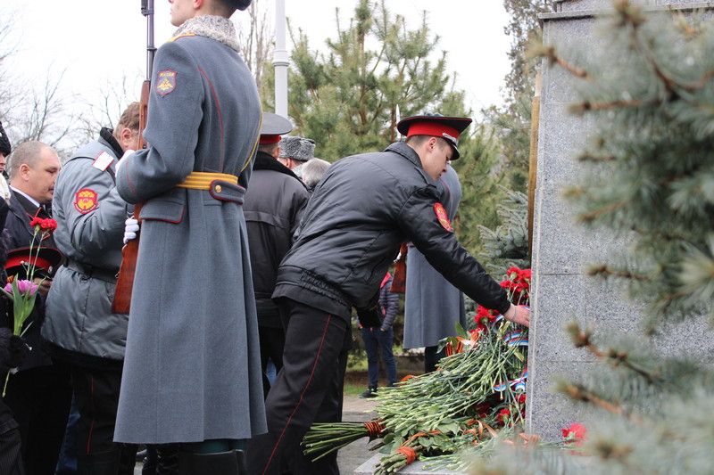 Цветы возложили к памятнику возле братской могилы на Всесвятском кладбище Краснодара. Здесь покоятся останки советских воинов, погибших в боях с немецко-фашистскими захватчиками, замученных в плену, умерших от ран.