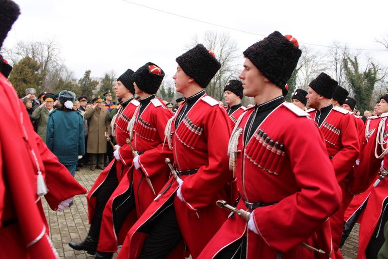 Прозвучали гимны России и Кубани в исполнении духового оркестра. После этого торжественным маршем прошли военнослужащие Краснодарского гарнизона, почетный караул Кубанского казачьего войска.