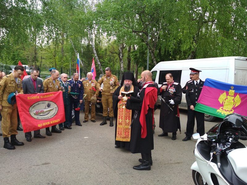 Мотопробег стартовал из Сочи в Берлин, через Ставрополь, Краснодар, Ростов и Москву. В Чистяковской роще Краснодара казаки Екатеринодарского районного казачьего общества вместе с настоятелем храма Всех Святых архимандритом Трифоном (Плотниковым) встретили представителей мотоклуба.
