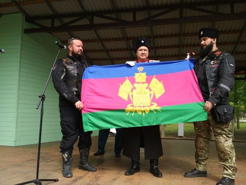 После молебна и возложения цветов к мемориалу Жертвам фашизма состоялся митинг, на котором помощник атамана Екатеринодарского РКО Герой России Сергей Палагин предал флаг Кубани участникам мотопробега.