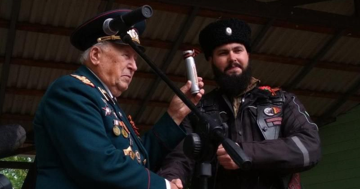 Ветеран Великой Отечественной войны, почётный гражданин города Краснодара Дмитрий Жалиев вручил мотоциклистам капсулу с Кубанской землёй.