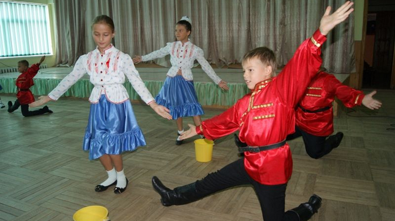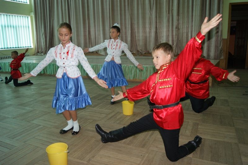 В концертном зале для гостей выступили казачата из центра детского творчества «Созвездие» с танцевальным номером «казачок».