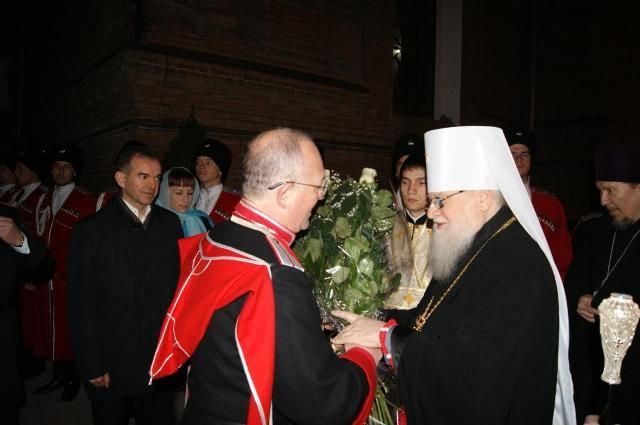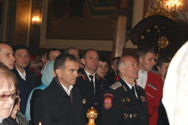 Вместе с прихожанами в праздничной Божественной литургии в Свято-Екатерининском кафедральном соборе приняли участие: губернатор Кубани Вениамин Кондратьев, глава Краснодара Евгений Первышов, атаман Кубанского казачьего войска Николай Долуда, а так же более 80 казаков Екатеринодарского районного казачьего общества во главе с атаманом, есаулом Сергеем Васиным.