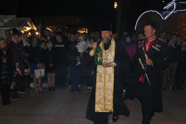 По традиции перед началом праздничной литургии в Свято-Екатерининский собор из Иерусалима был доставлен Благодатный огонь, от которого зажгли свечи в зале и передали во все храмы Кубани.
