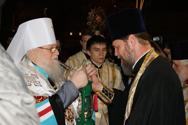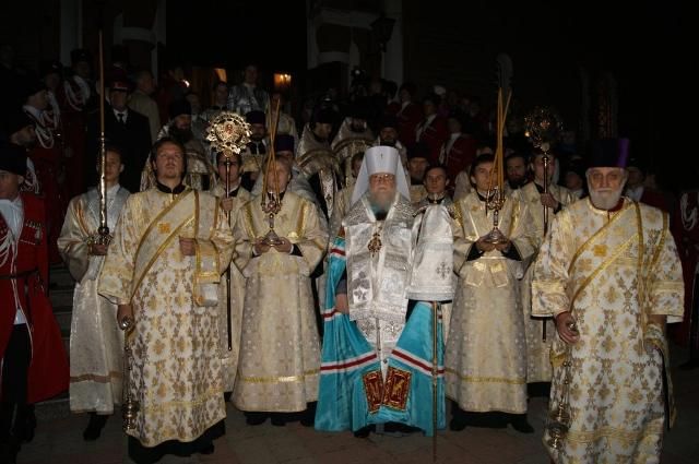 Ближе к полуночи под звон колоколов прихожане во главе с митрополитом Исидором совершили крестный ход и возвестили о Воскресении Христовом.