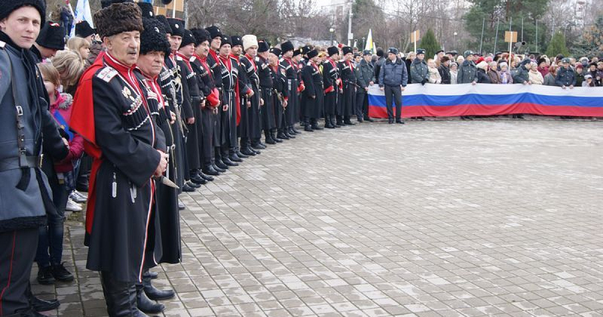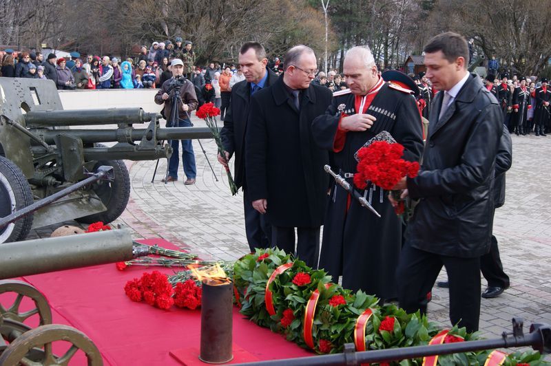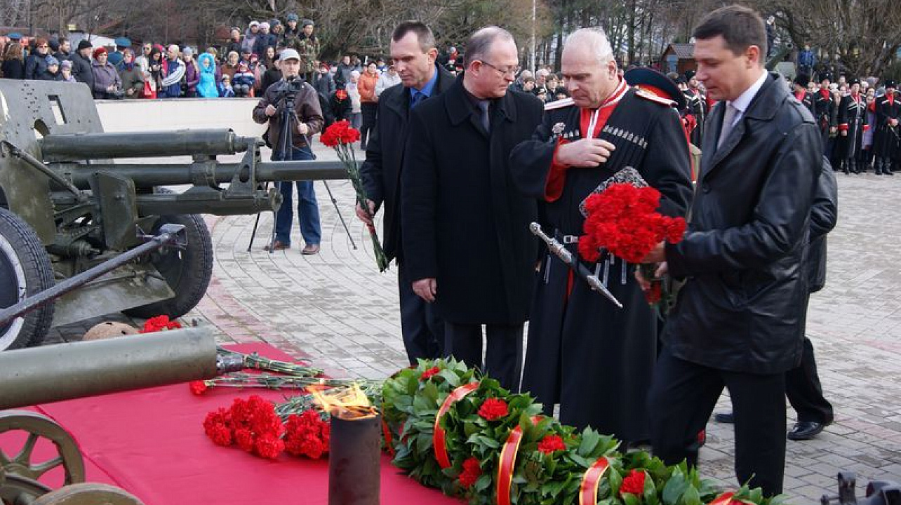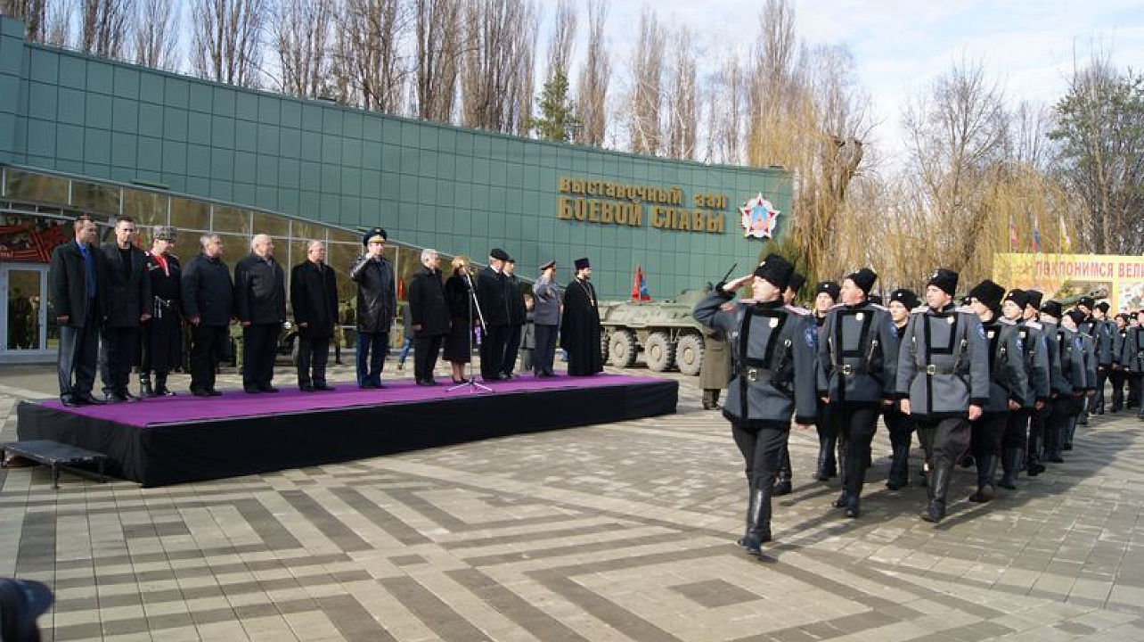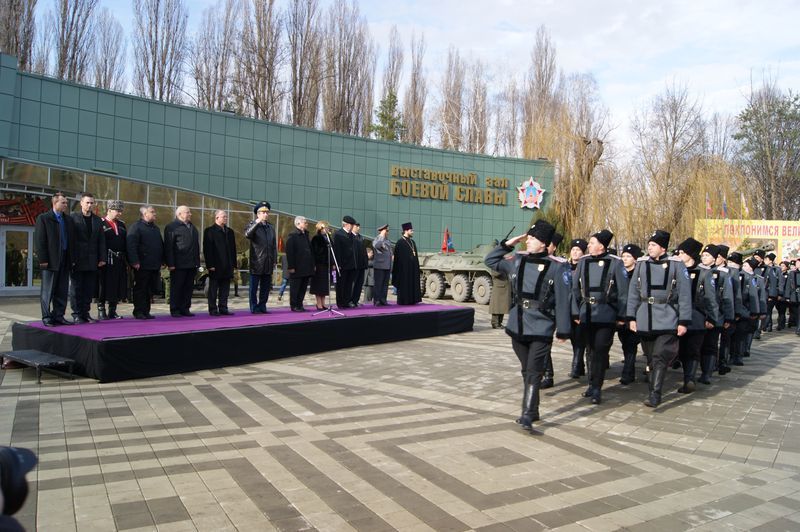 После возложения цветов под звуки военного духового оркестра торжественным маршем по площади прошли знаменная группа с флагами, военнослужащие Краснодарского гарнизона и казаки Екатеринодарского районного казачьего общества.