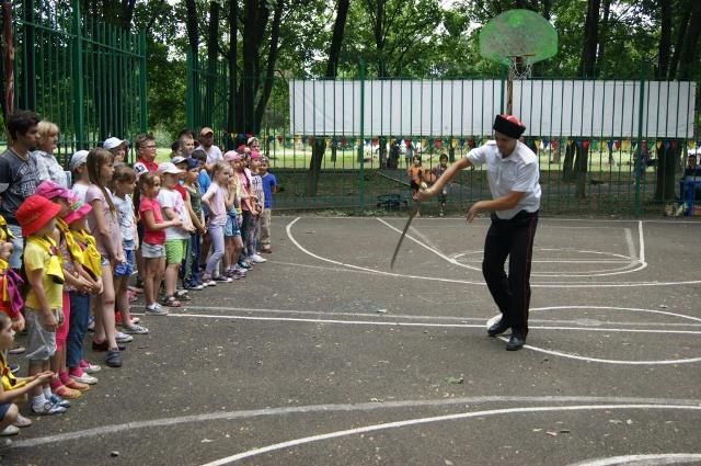 Затем казаки рассказали ребятам об элементах одежды и вооружении казака, продемонстрировав работу с традиционным казачьим оружием, после чего команды разошлись по станциям, где юным казачатам предстояло пройти испытания.