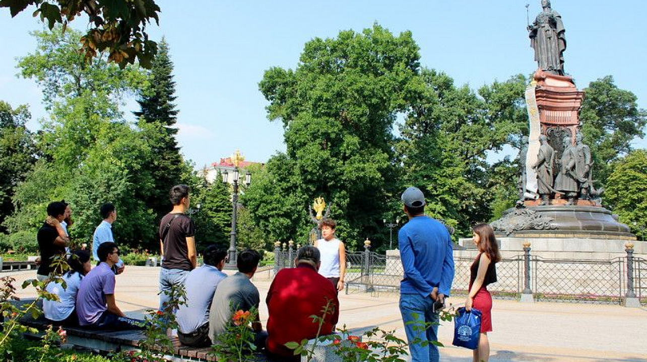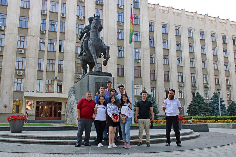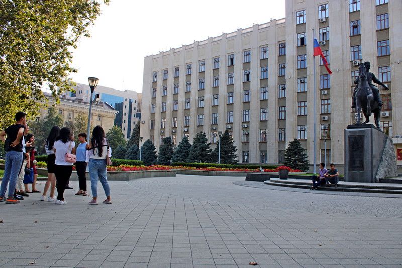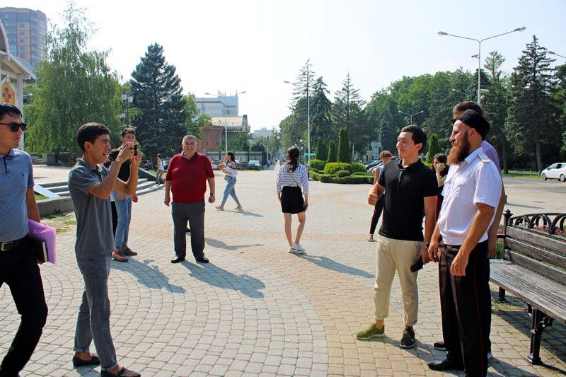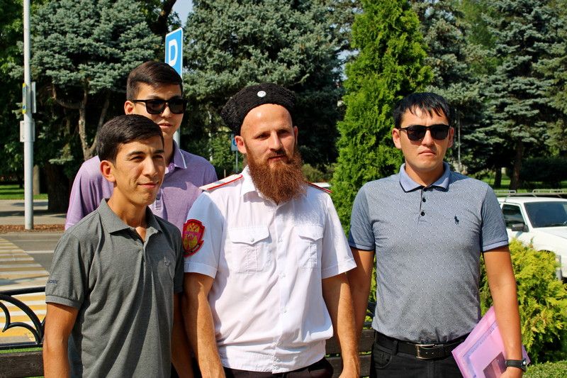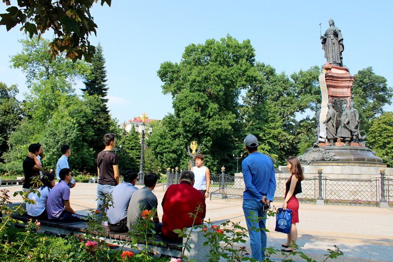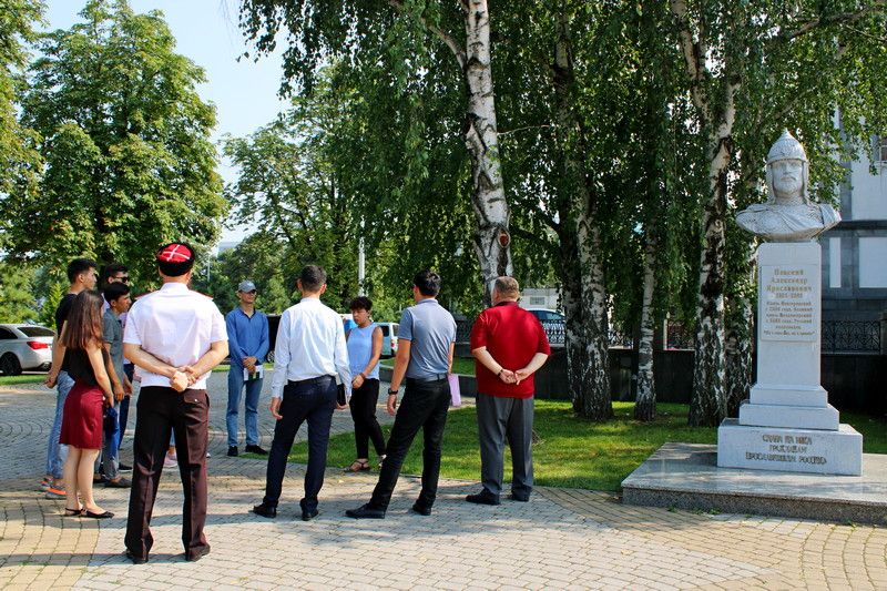 Далее неспешным шагом делегация из Узбекистана прошла мимо казачьей площади и здания законодательного собрания края к памятнику императрице Екатерине II, которая даровала казакам эту землю. Молодым ребятам было очень интересно слушать и даже палящий кубанский зной не так сильно отвлекал, далее экскурсия прошла мимо концертного зала Кубанского казачьего хора вдоль по улице Красной, здания которой таят в себе сотни лет истории Кубанских казаков.