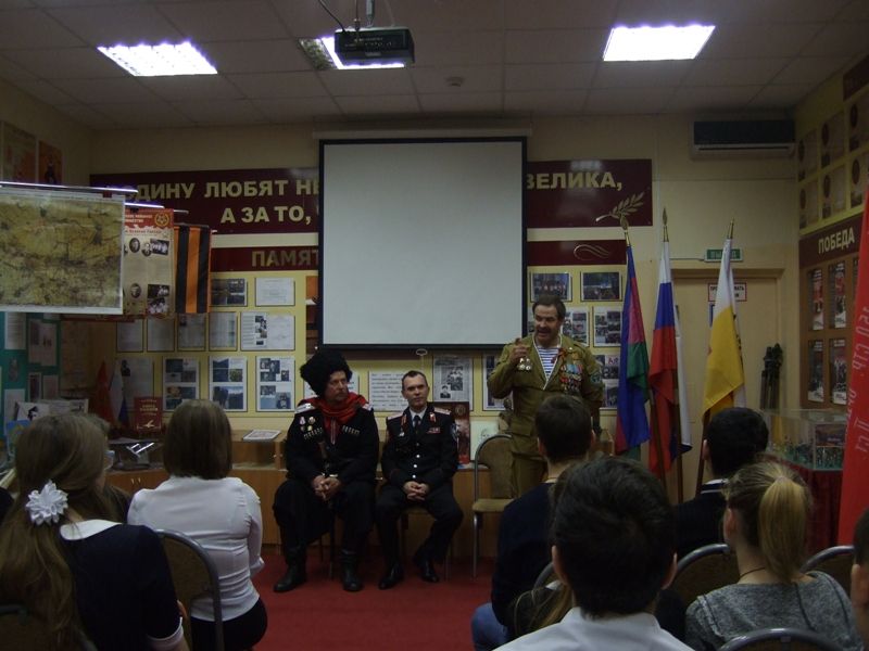 В ходе встречи старшеклассники познакомились с Виктором Александровичем Кирсановым – ведущим специалистом управления по делам казачества и военнослужащих МО город Краснодар, председателем «Российского союза ветеранов Афганистана г.Краснодара.