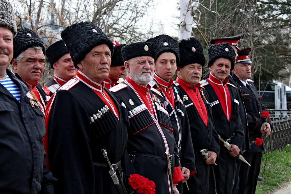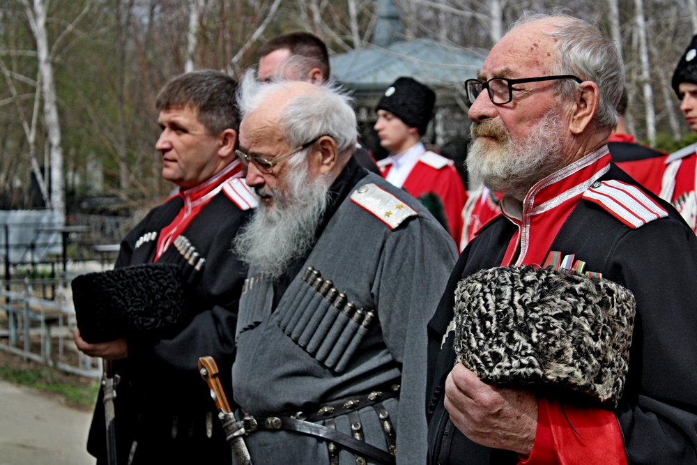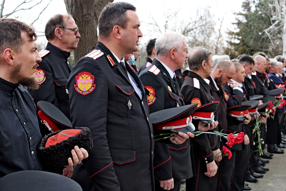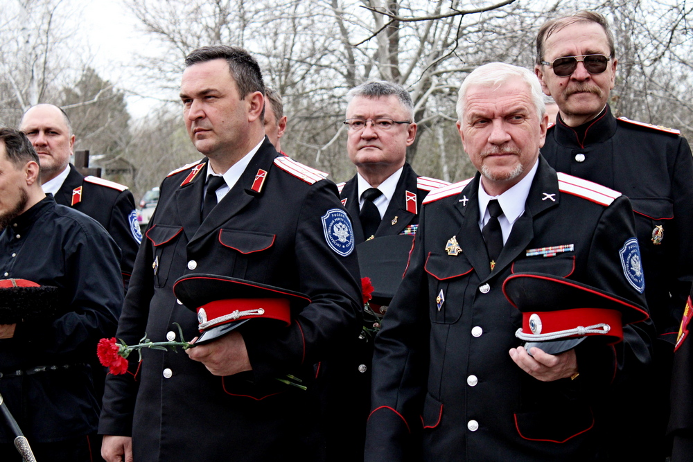 Возложили венки, цветы и почтили память убиенных атаман Кубанского казачьего войска Александр Власов, атаман Екатеринодарского отдела Вадим Чернов, атаман Екатеринодарского Василий Павлик, походный атаман Алексей Аникин и участник боевых действий, начальник штаба в Приднестровье Николай Конограй.