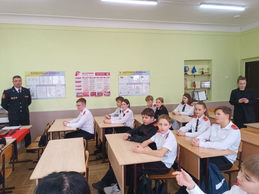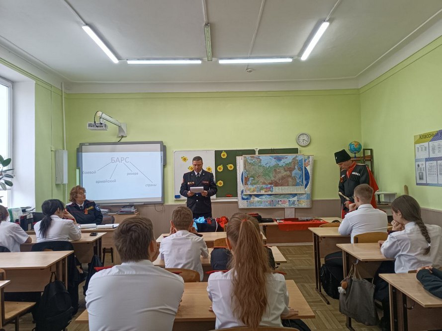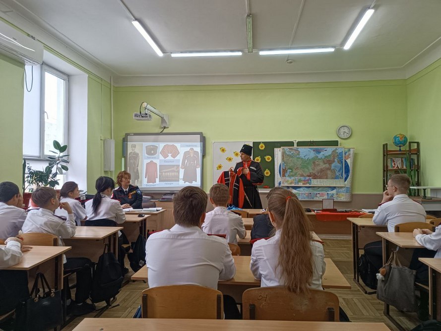 Не меньший интерес вызвал рассказ специалиста МКУ «Центр развития традиционной казачьей культуры города Краснодара», который принимал участие в боевых действиях на Специальной военной операции. Во время рассказа ученики могли задать интересующие их вопросы.