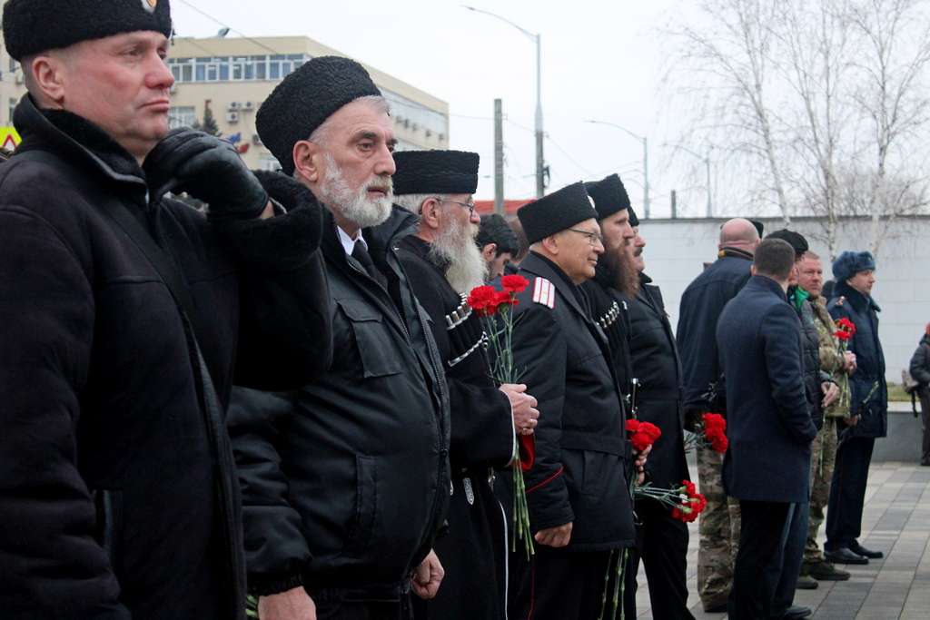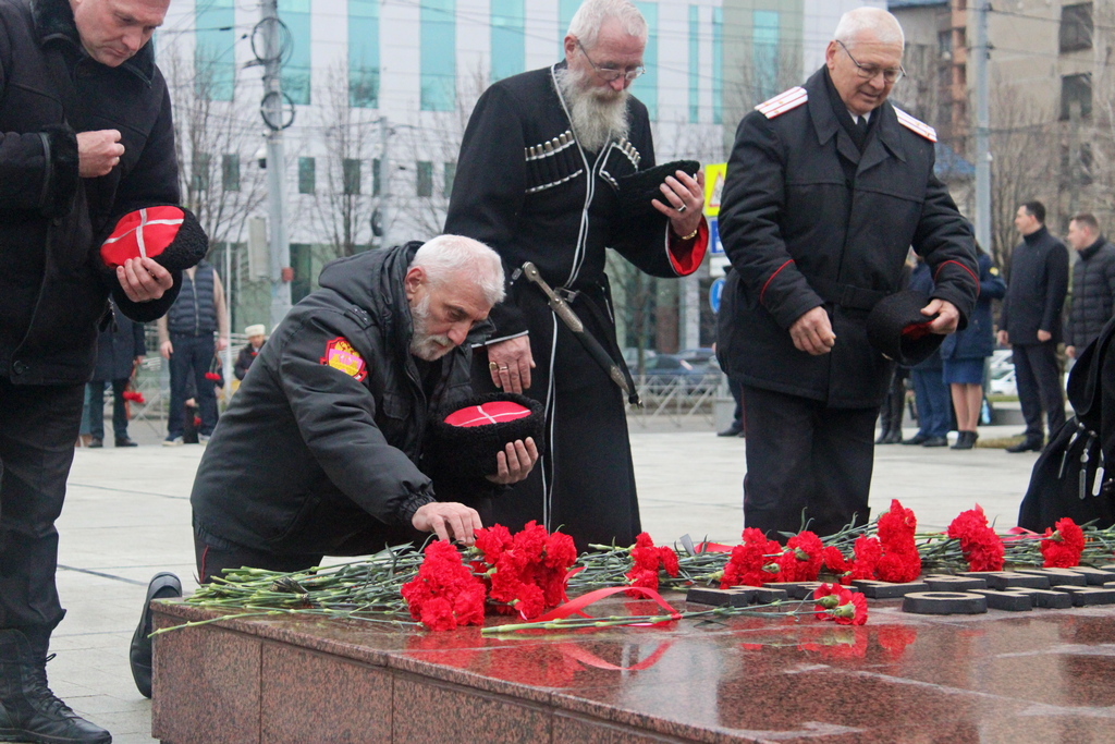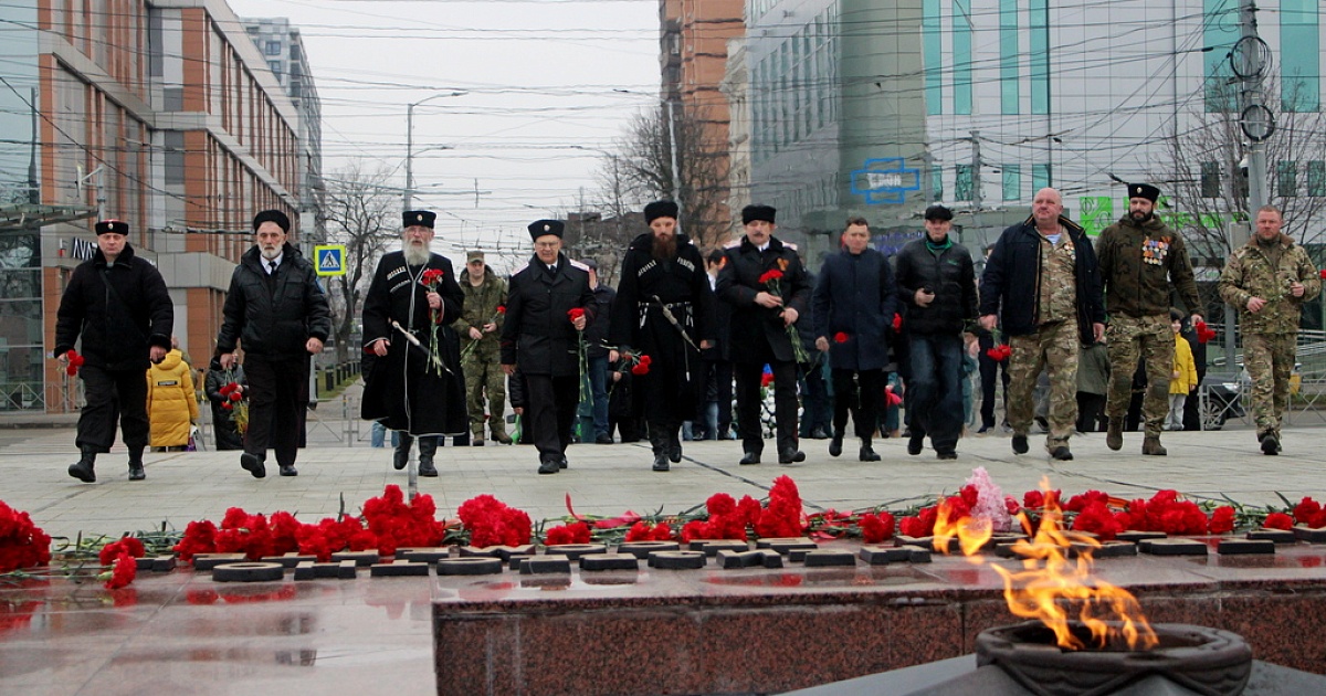 В честь праздника Дня защитника Отечества специалисты МКУ «Центр развития традиционной казачьей культуры города Краснодара» совместно с депутатами, казаками Екатеринодарского РКО, военнослужащими, активистами общественных организаций и горожанами провели традиционную церемонию возложения цветов к Мемориалу "Вечный огонь" на площади Памяти героев города Краснодара.