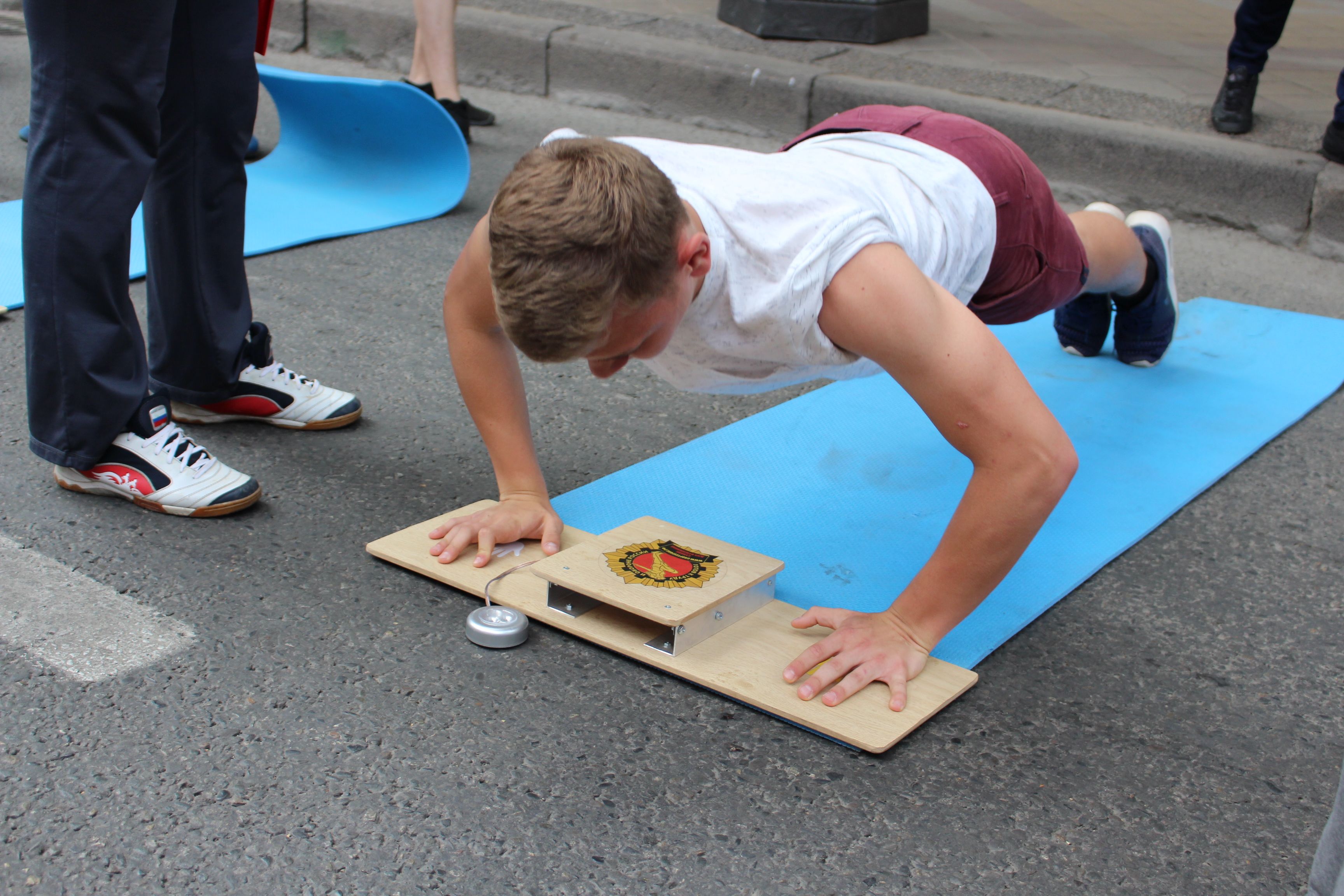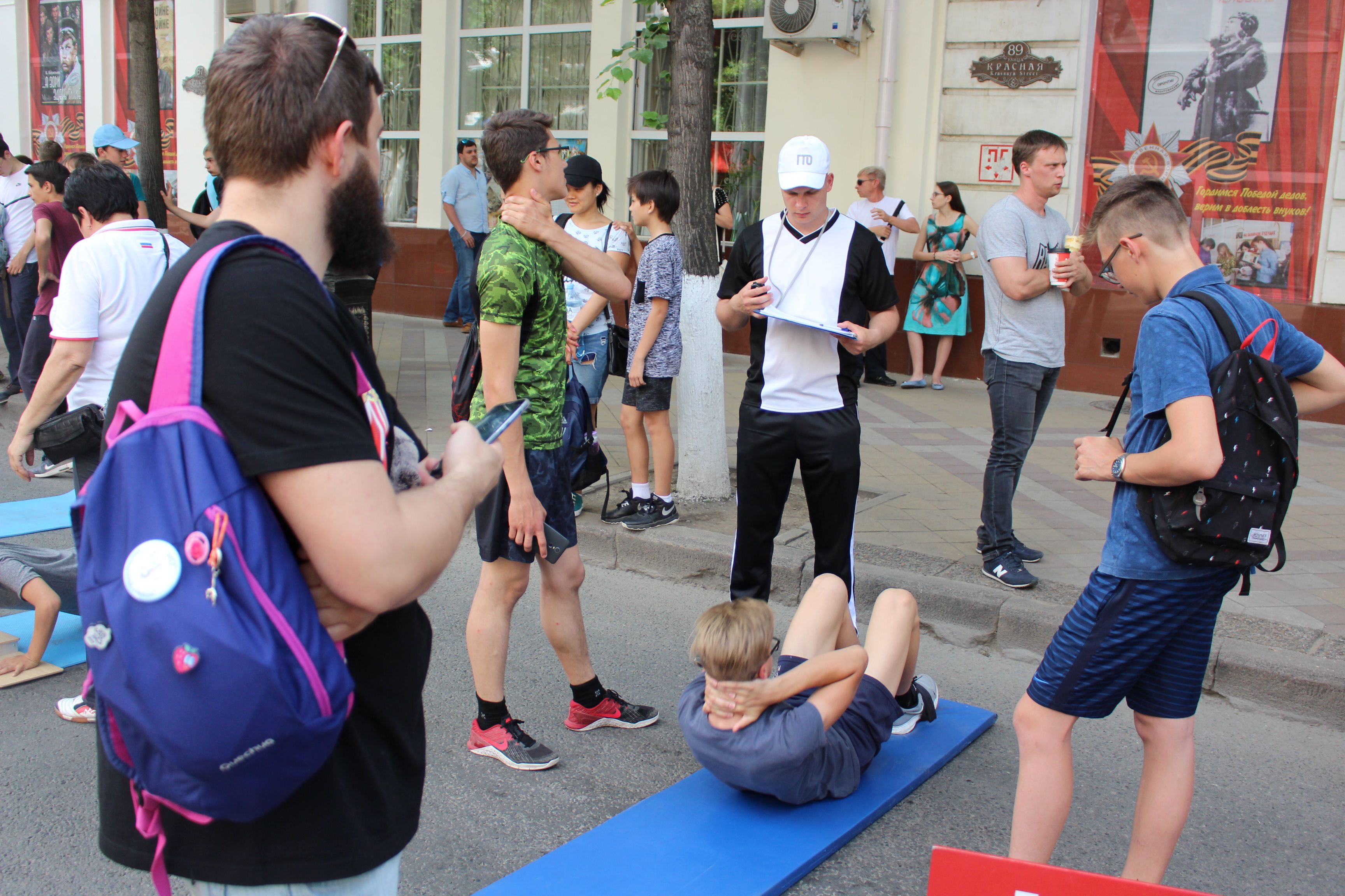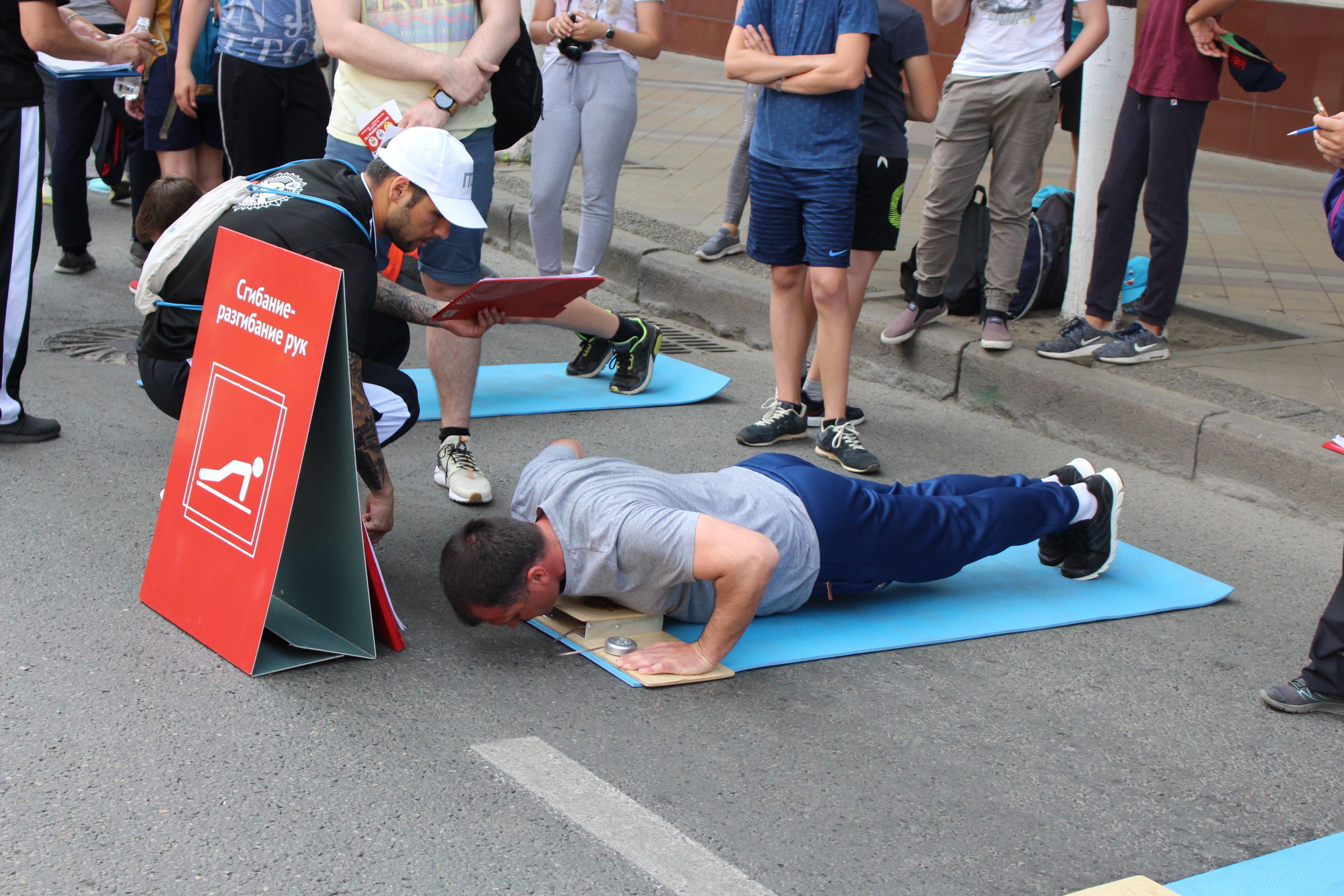 Жители и гости города, предварительно зарегистрировавшиеся на сайте www.gto.ru, оценивали свое физическое развитие в выполнении следующих нормативов: сгибание и разгибание рук в упоре лежа, наклон вперед из положения стоя, поднимание туловища из положения лежа, рывок гири, а также бег на короткие дистанции.