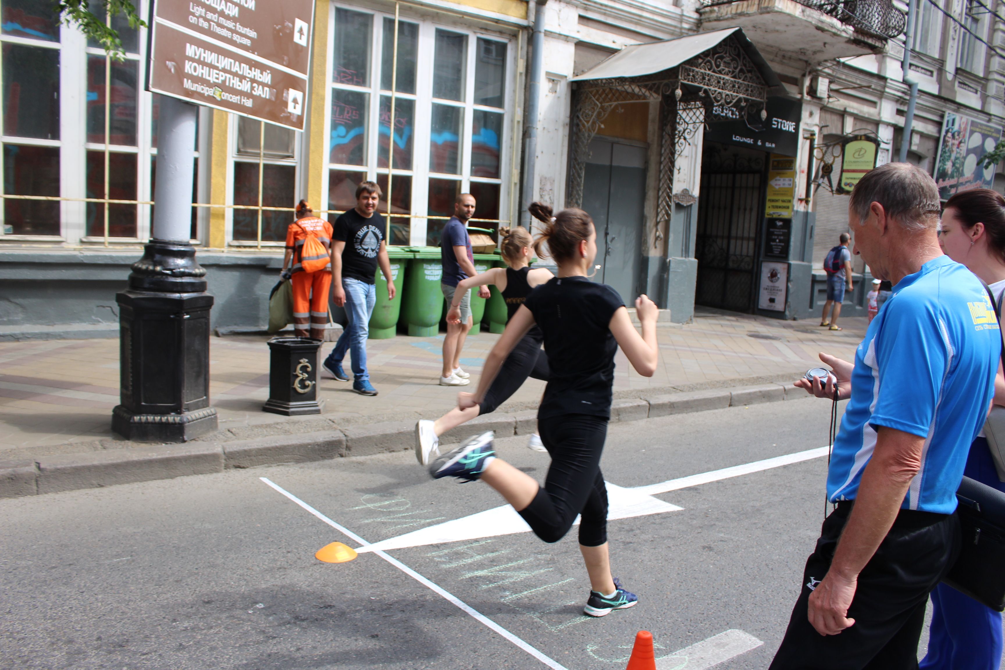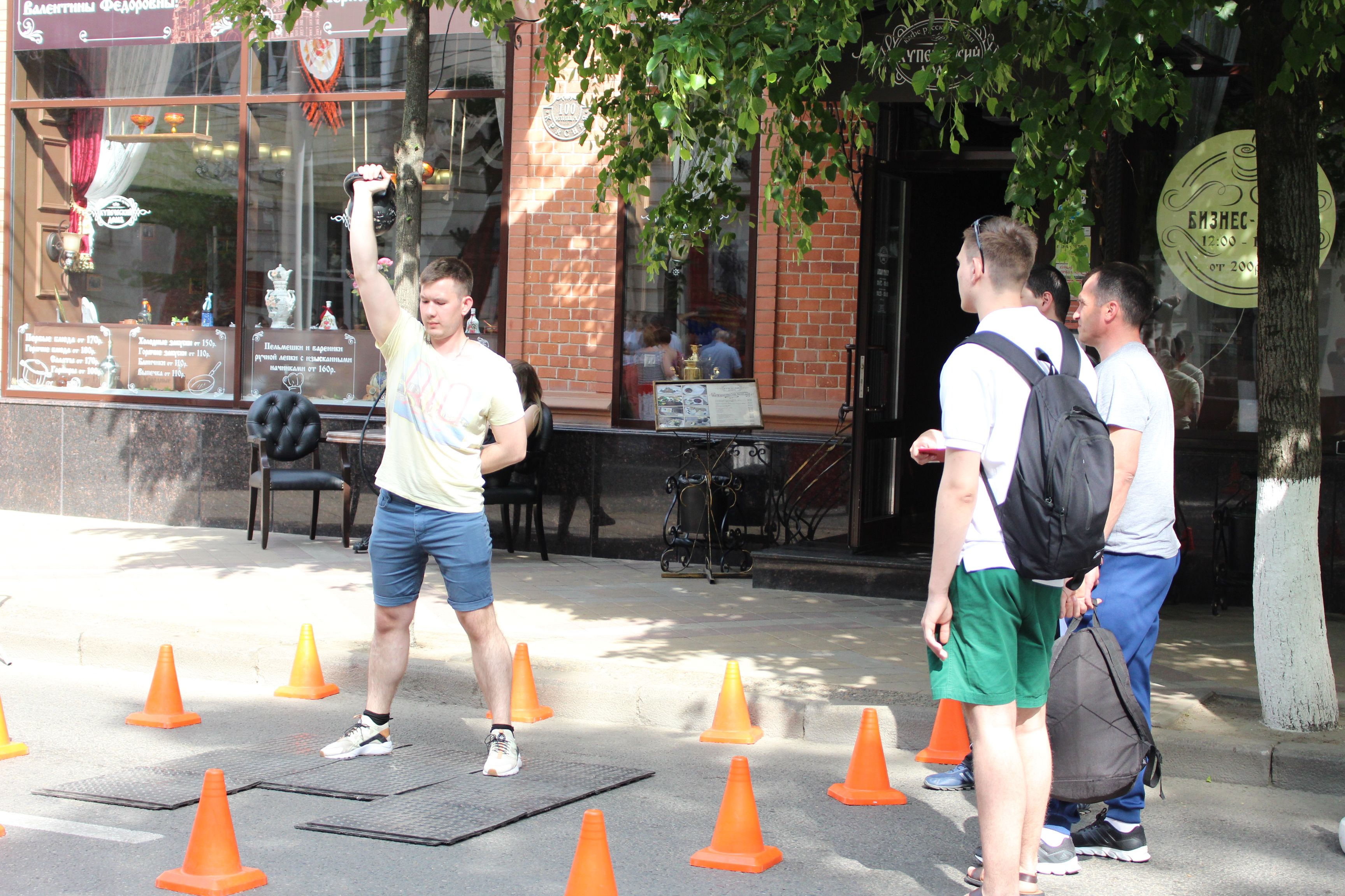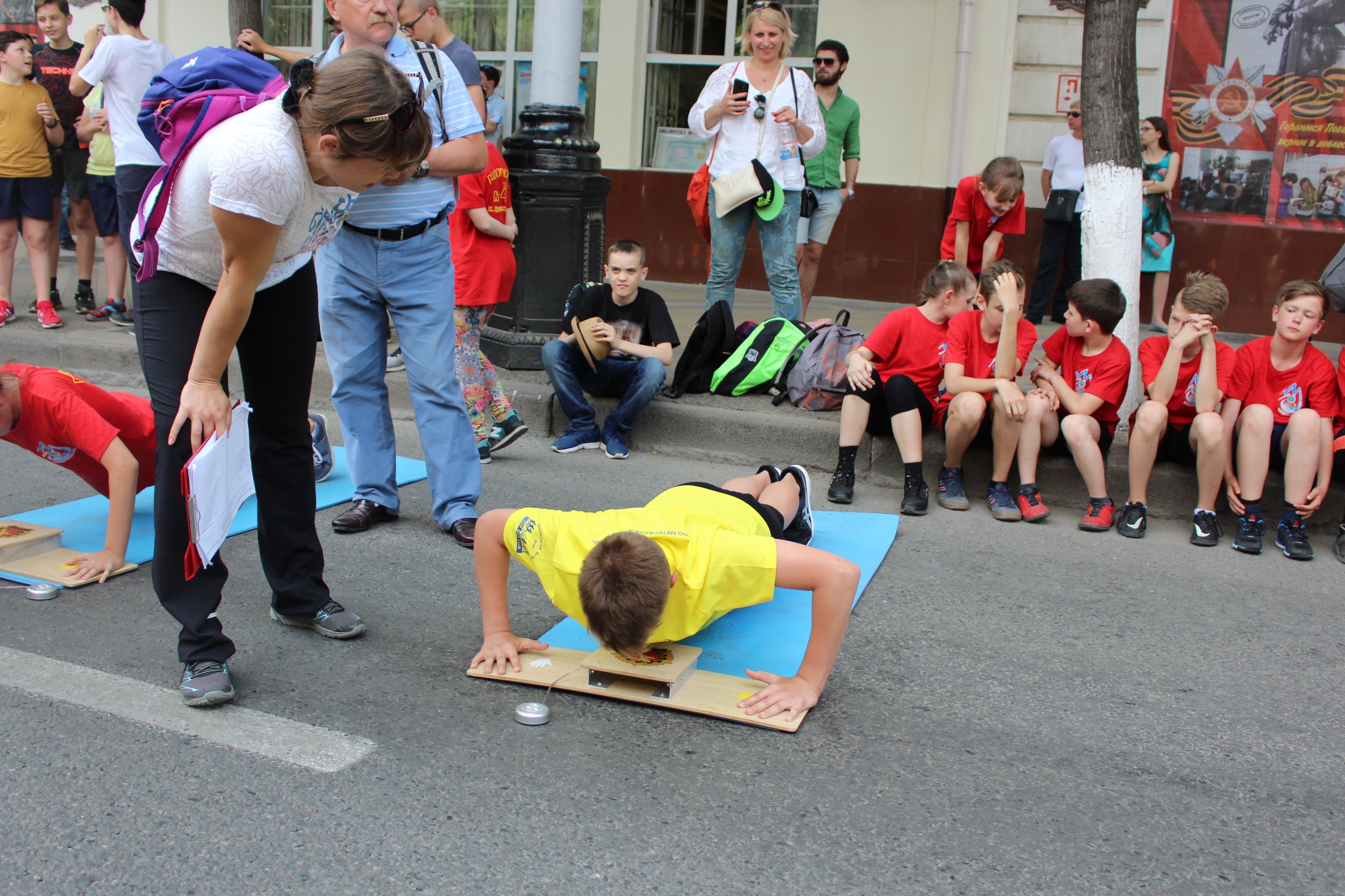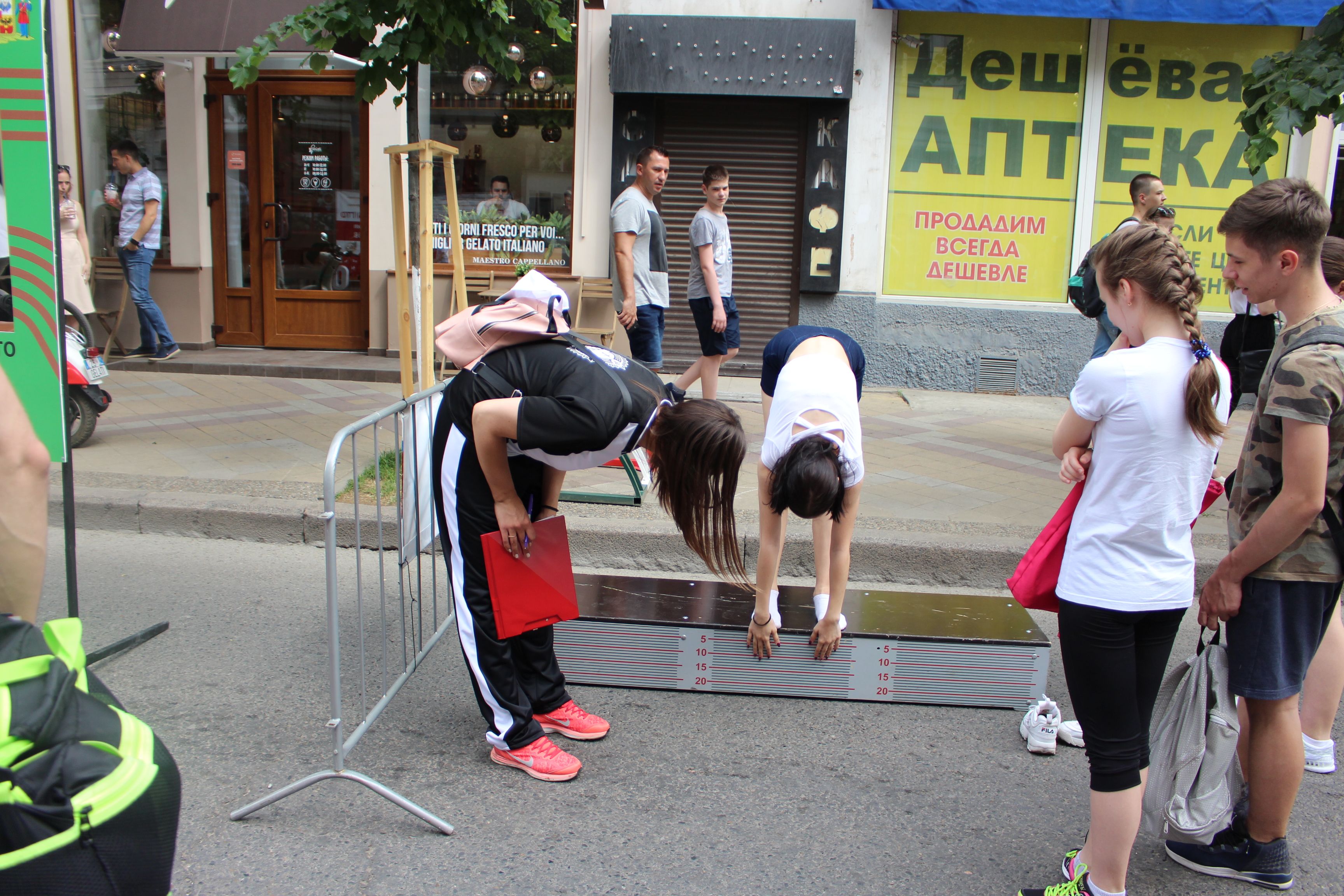 Жители и гости города, предварительно зарегистрировавшиеся на сайте www.gto.ru, оценивали свое физическое развитие в выполнении следующих нормативов: сгибание и разгибание рук в упоре лежа, наклон вперед из положения стоя, поднимание туловища из положения лежа, рывок гири, а также бег на короткие дистанции.