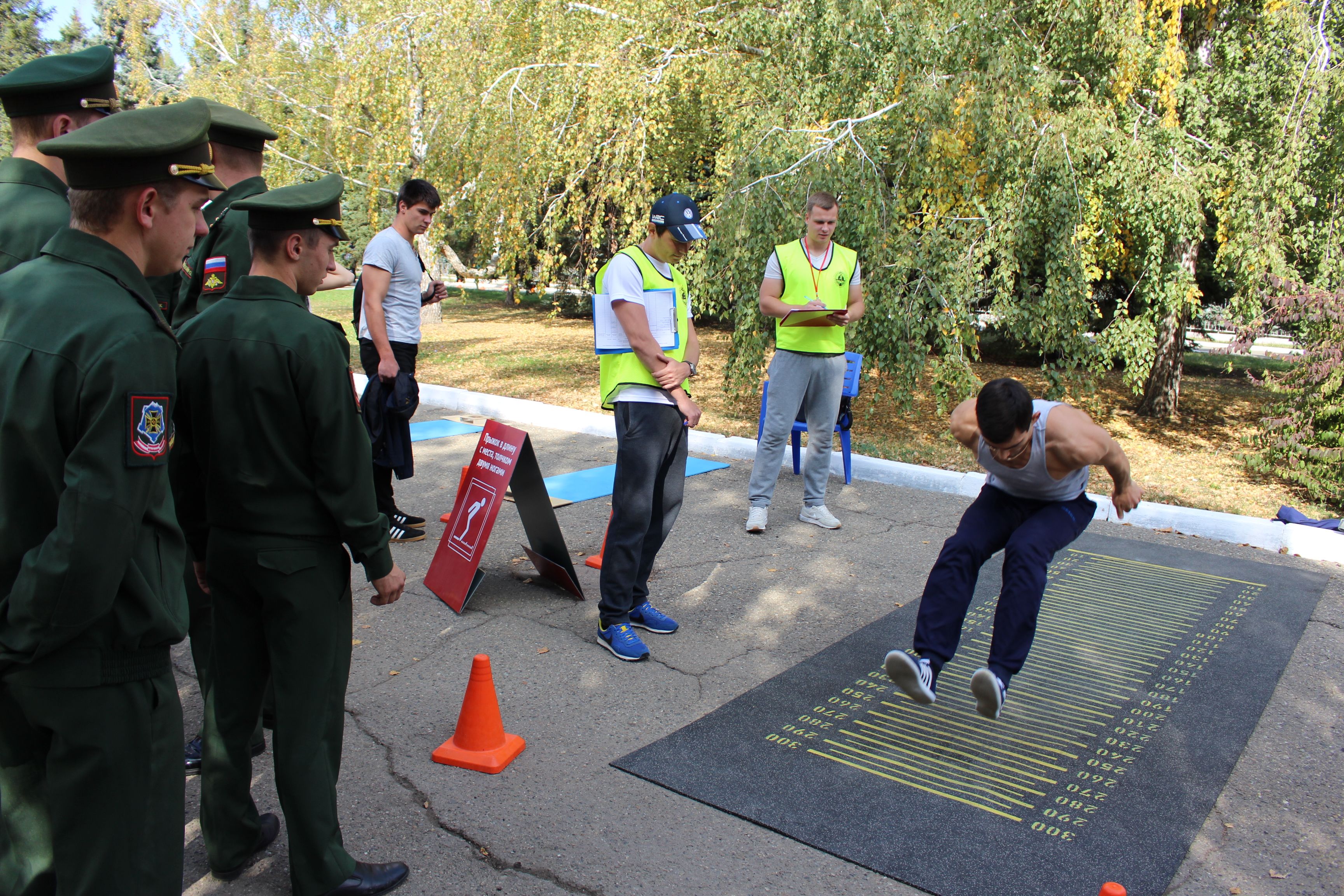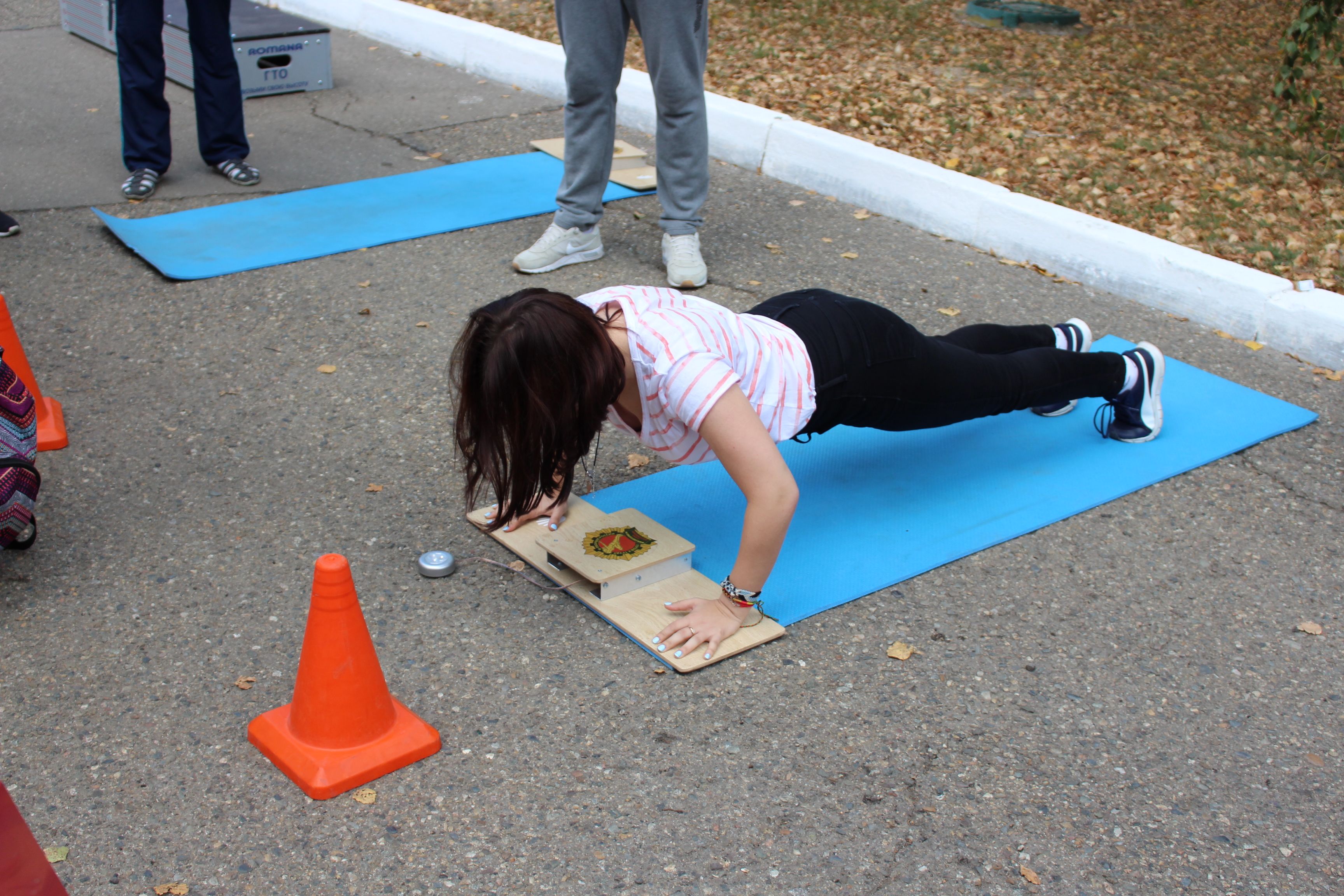 Студенты проверяли свои силы в наклоне вперед из положения стоя, сгибании и разгибании рук в упоре лежа, поднимании туловища из положения лежа, рывке гири и прыжке в длину.