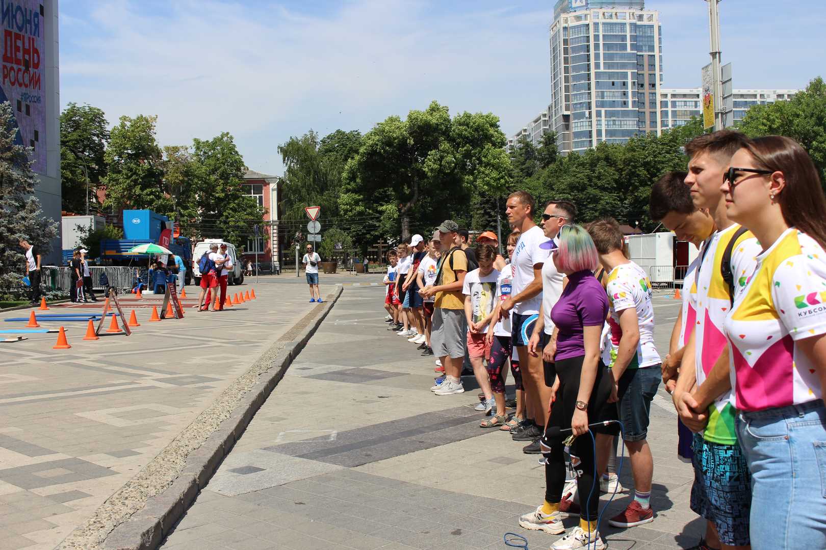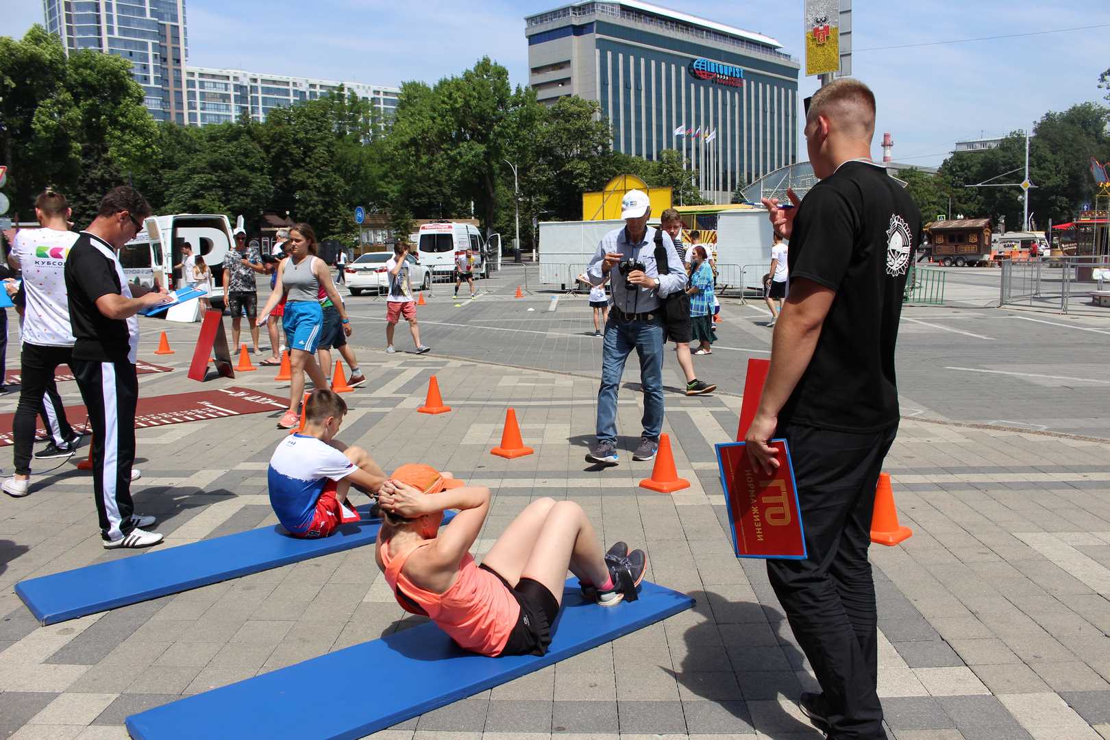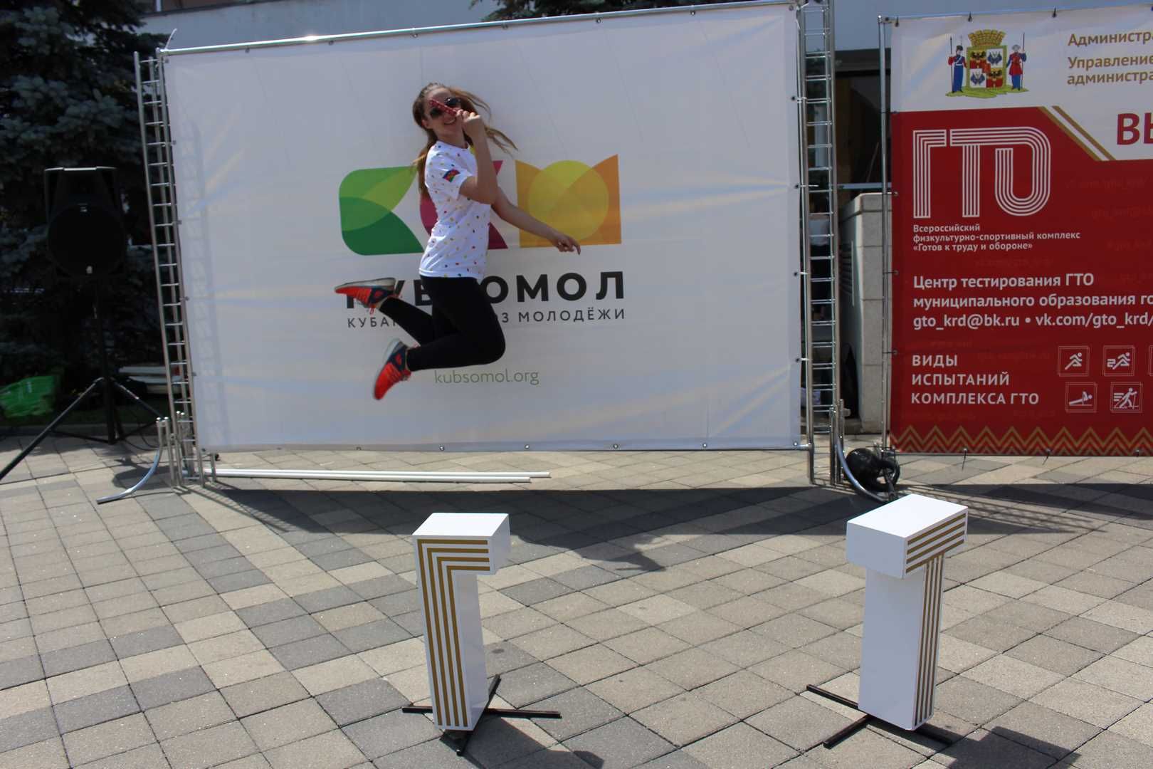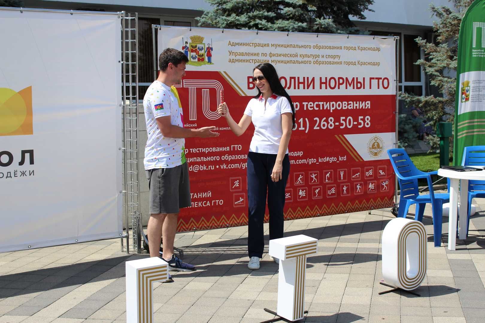 В День России на Главной городской площади состоялось физкультурно-спортивное мероприятие комплекса ГТО. В рамках праздника Краснодарская краевая молодежная общественная организация «Кубанский союз молодежи» приняла эстафету комплекса ГТО и выполнила тестирование комплекса.