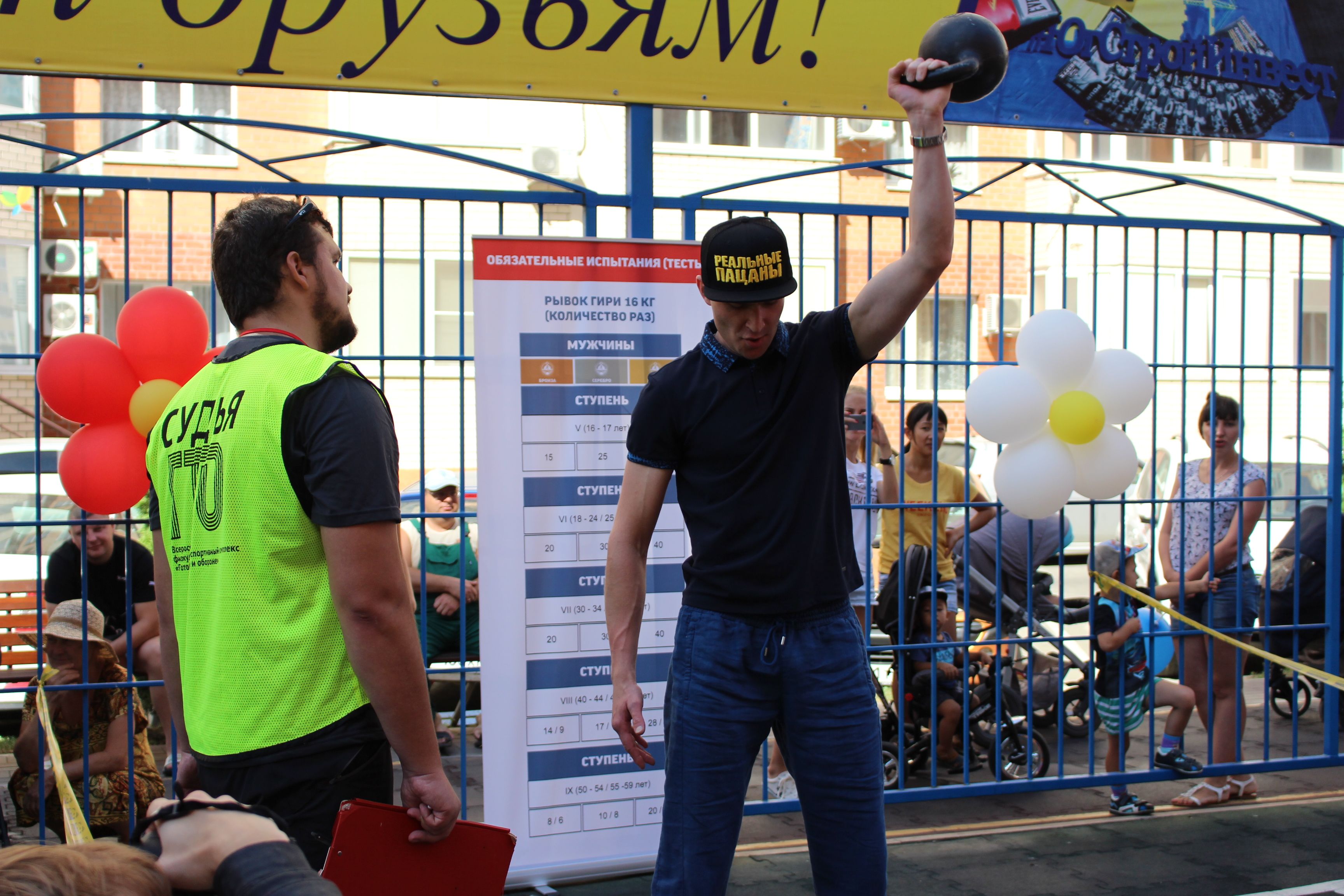 После торжественного открытия и танцевальной разминки участники приступили к выполнению нормативов. Поднимание туловища из положения лежа, подтягивание из виса на высокой перекладине, сгибание и разгибание рук в упоре лежа на полу, наклон вперед с прямыми ногами на гимнастической скамье, бег на короткие дистанции и рывок гири помогали оценивать свое физическое развитие. Также для участников спортивного мероприятия прошли показательные выступления по нормативу «самбо».