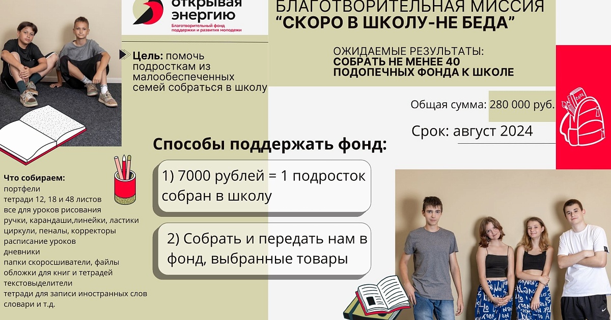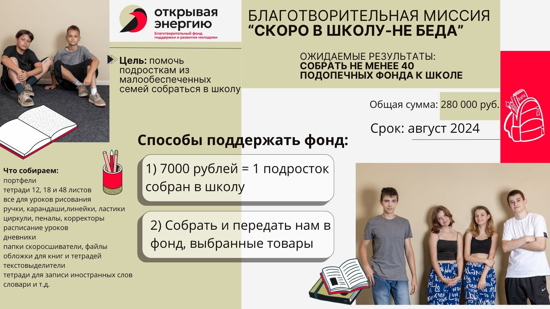 Благотворительный фонд поддержки и развития молодёжи «Открывая энергию» проводит акцию «Скоро в школу – не беда». Её цель – подготовить подростков из многодетных и малоимущих семей к новому учебному году.