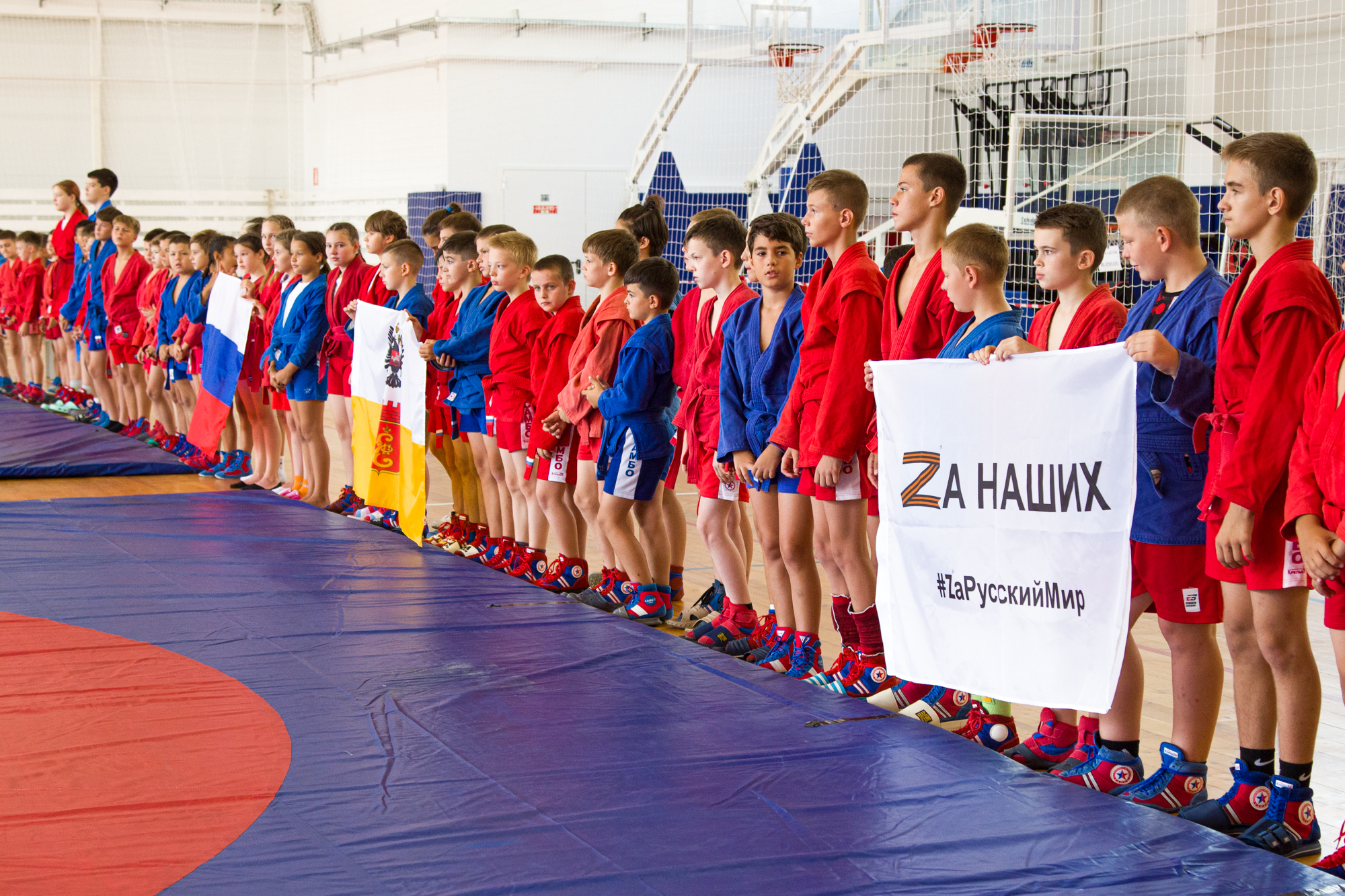 С торжественного построения и развёртывания российского триколора начался сегодня городской классификационный турнир по самбо.