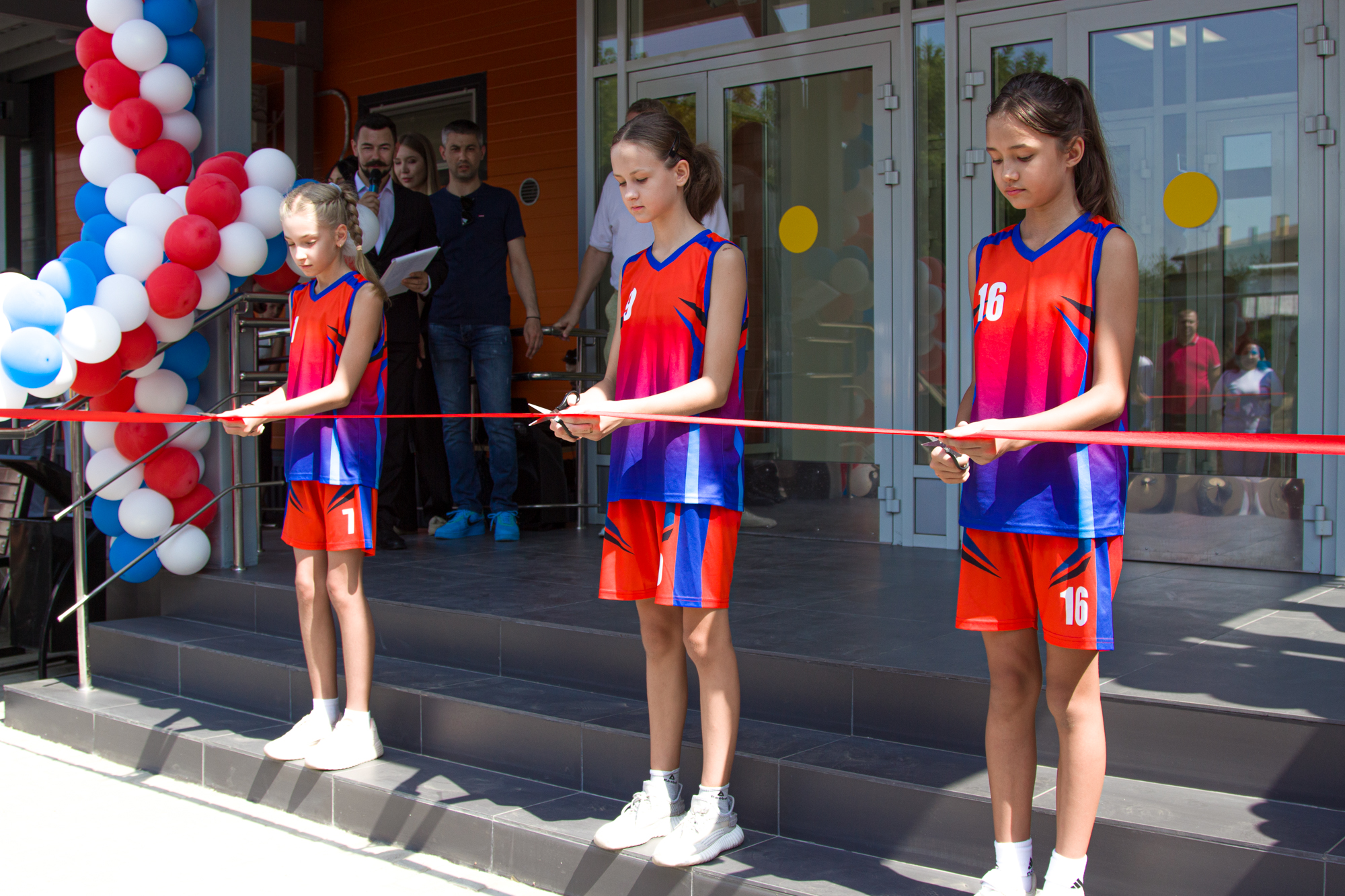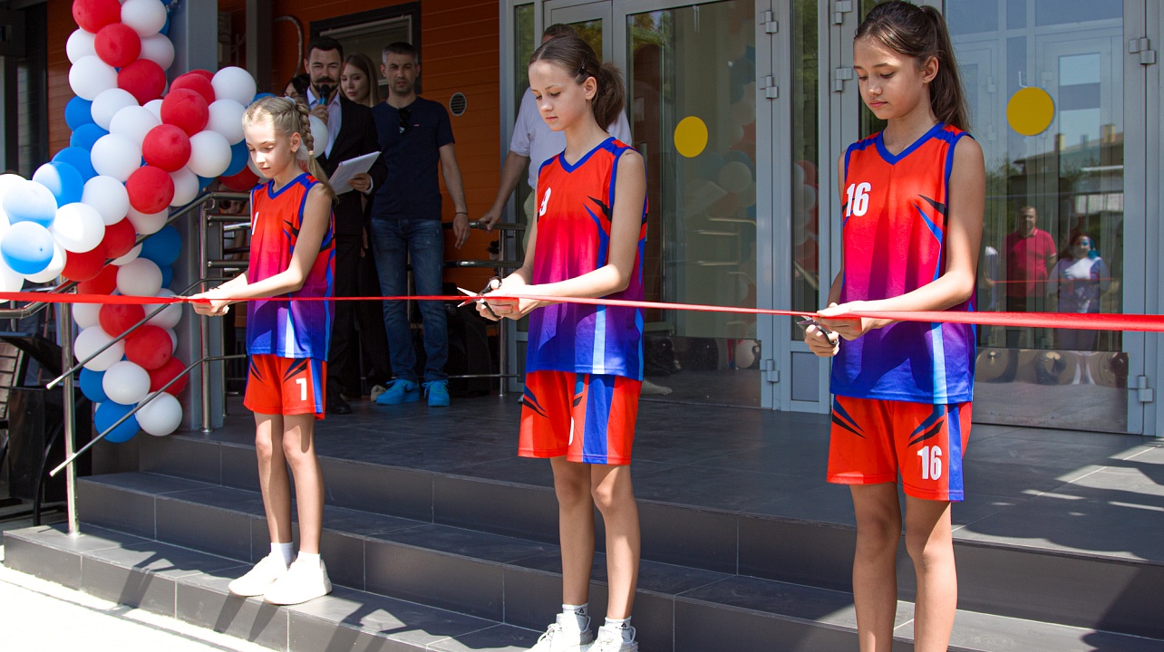 Право перерезать ленточку у входа в новый ФОК предоставили воспитанницам спортивной школы олимпийского резерва №1.