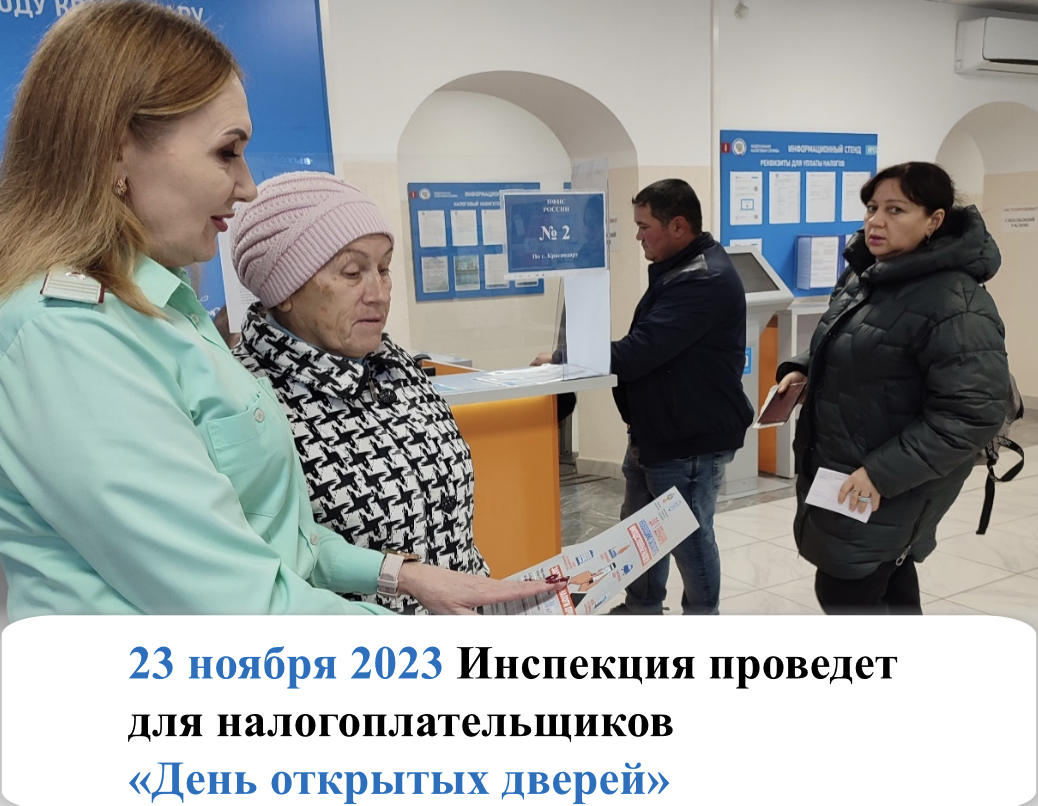 ИФНС России № 2 по г. Краснодару приглашает налогоплательщиков- жителей Краснодарского края принять участие в Дне открытых дверей для своевременной уплаты налогов, который состоится 23 ноября 2023 года с 9.00 до 20.00 по адресу: ул. Коммунаров 235.
