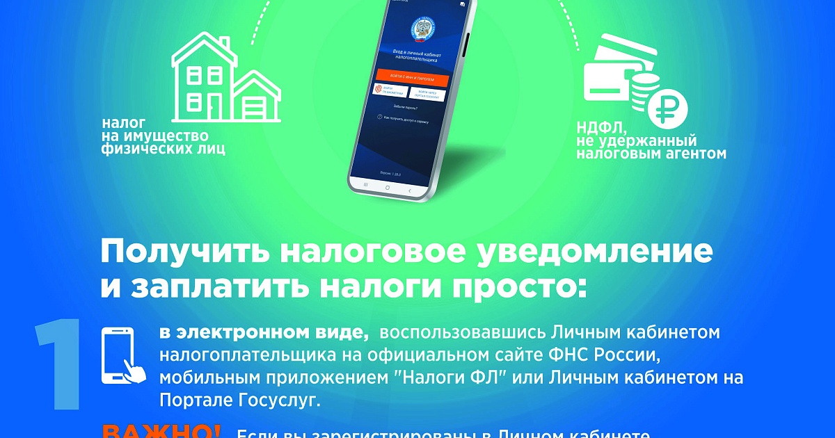6 октября 2023Инспекция информирует, что налоговое уведомление может быть направлено налогоплательщику по почте заказным письмом или передано в электронной форме через личный кабинет налогоплательщика, начиная с