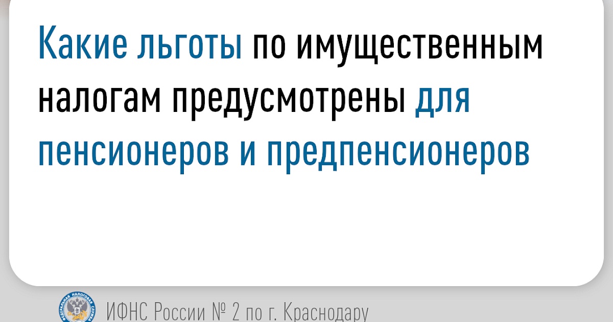 17 апреля 2025Инспекция ФНС России № 2 по г. Краснодару информирует, что пенсионеры и предпенсионеры (женщины 55 лет и мужчины 60 лет, а также лица, достигшие возраста для назначения досрочной пенсии) имеют право на налоговые льготы (ст. 407 НК РФ).