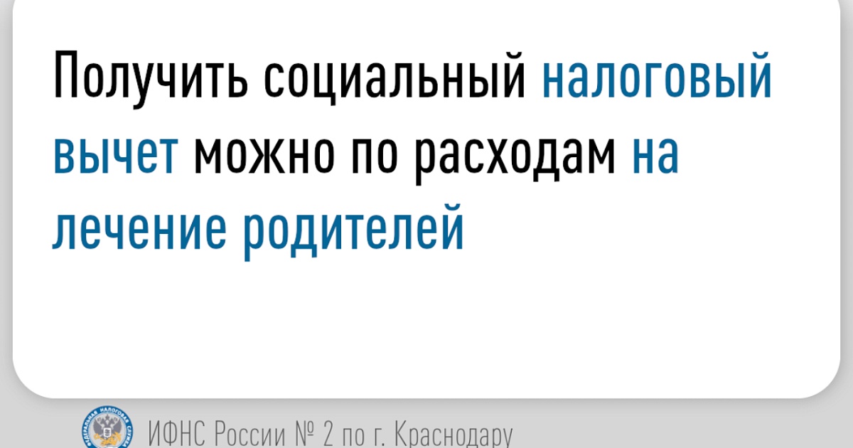 ИФНС России № 2 по г. Краснодару напоминает, что можно получить социальный налоговый вычет по расходам на лечение родителей.