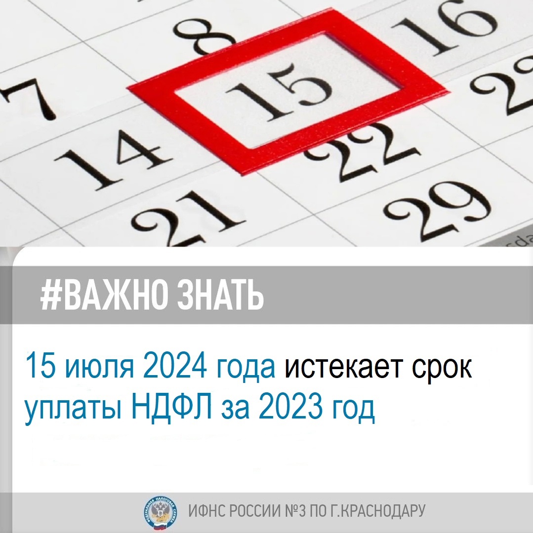 ИФНС России №3 по г.Краснодару напоминает. 15 июля – последний день для уплаты НДФЛ за 2023 год. Уплатить налог должны граждане, которые были обязаны представить налоговую декларацию 3-НДФЛ за 2023 год не позднее 2 мая 2024 года с исчисленной в ней суммой налога. Это лица, которые: ✅продали недвижимость, находившуюся в собственности менее трёх лет, ✅получили в дар не от близких родственников недвижимость, транспорт, акции и др., ✅получили вознаграждения не от налоговых агентов, выиграли от 4000 до 15000 рублей в лотереях, тотализаторах, азартных играх, ✅получили доходы от источников за пределами РФ. Уплатить НДФЛ в указанный срок обязаны также индивидуальные предприниматели, нотариусы, занимающиеся частной практикой, адвокаты, учредившие адвокатские кабинеты, и другие лица, занимающиеся частной практикой. Быстро и удобно уплатить налог можно с помощью интерактивных сервисов ФНС России «Уплата налогов и пошлин», «Личный кабинет налогоплательщика ФЛ» и «Личный кабинет ИП». С 16 июля за каждый просроченный день уплаты НДФЛ будет начисляться пеня исходя из 1/300 ставки рефинансирования Банка России.