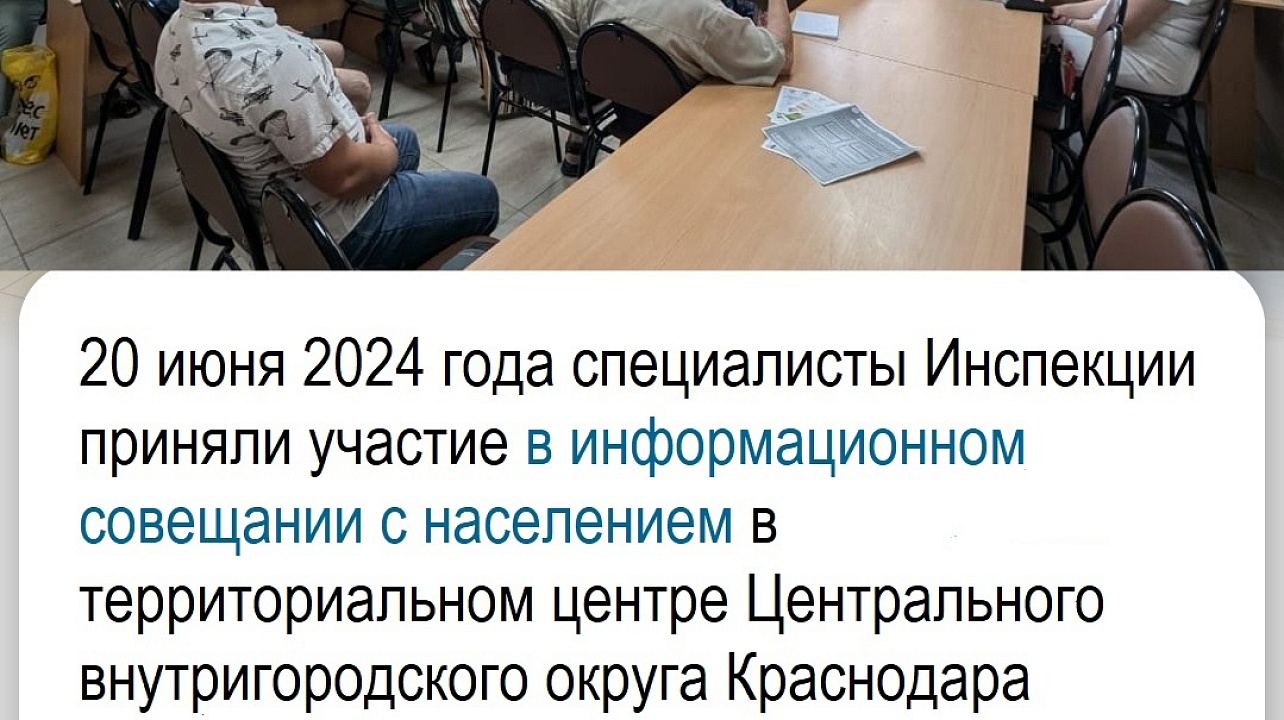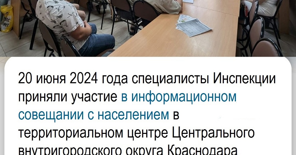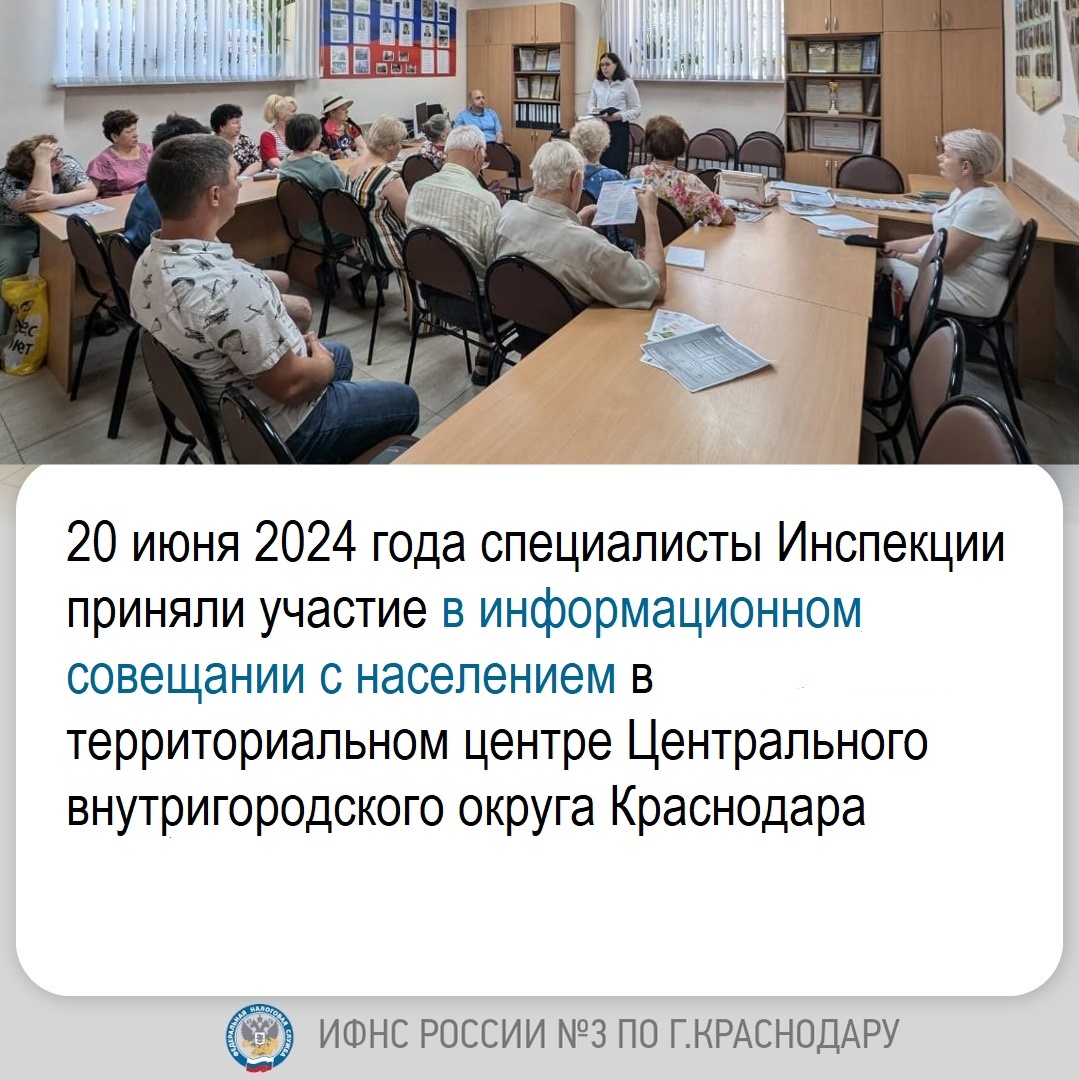 20.06.2024 г. сотрудники ИФНС России № 3 по г. Краснодару приняли участие в информационном совещании в территориальном центре №38 Центрального внутригородского округа города Краснодара по адресу г.Краснодар, ул.Колхозная, 77.
