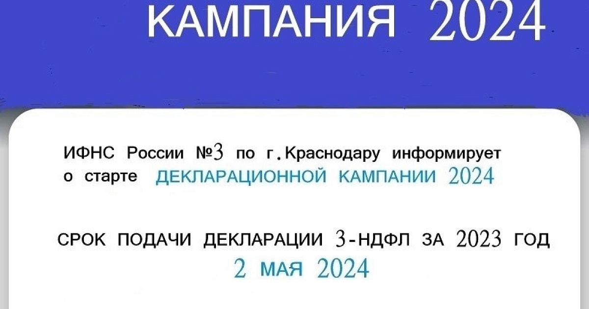 ❗ДЕКЛАРАЦИОННАЯ КАМПАНИЯ 2024❗ ИФНС России №3 по г. Краснодару информирует, что с января 2024 стартовала декларационная кампания по налогу на доходы физических лиц, в ходе которой физические лица отчитываются о доходах, полученных в 2023 году. Обязанность по представлению декларации 3-НДФЛ возникает в следующих случаях: ✅продажа имущества, которое находилось в собственности меньше минимального срока владения; ✅сдача имущества в аренду; ✅получение подарков не от близких родственников; ✅выигрыш в лотерею; ✅получение дохода из источников за пределами Российской Федерации. ✅Отчитаться о своих доходах также должны индивидуальные предприниматели, нотариусы, занимающиеся частной практикой, адвокаты, учредившие адвокатские кабинеты и другие лица. ❗Заявить о доходах, подав декларацию 3-НДФЛ необходимо не позднее 2 МАЯ 2024 ❗Срок оплаты налога на доходы физических лиц — до 15 июля 2024. Подать декларацию можно лично, обратившись в налоговый орган по месту жительства или в МФЦ либо онлайн через сервис «Личный кабинет налогоплательщика» на сайте ФНС России www.nalog.gov.ru ❗Предельный срок подачи декларации не распространяется на получение налоговых вычетов. В этих случаях направить декларацию можно в любое время в течение года. Следует отметить, что c 1 января 2024 вступают в силу изменения налогового законодательства, которые позволяют получать в упрощенном порядке наиболее востребованные социальные вычеты: (за лечение, физкультурные услуги, обучение, страхование жизни и другие). Социальные налоговые вычеты в упрощенном порядке могут быть предоставлены в случае предоставления соответствующих сведений организациями и индивидуальными предпринимателями, которые присоединились к информационному взаимодействию в соответствии с правилами обмена информацией. В рамках налоговых мер поддержки граждан, начиная с расходов, понесенных в 2024 году, увеличены предельные размеры социальных вычетов: - максимальная сумма расходов на собственное обучение, либо обучения брата или сестры, в совокупности с другими расходами налогоплательщика, связанными, например, с лечением (за минусом расходов на обучение детей налогоплательщика и расходов на дорогостоящее лечение), уплатой взносов на накопительную часть трудовой пенсии, добровольное пенсионное страхование и негосударственное пенсионное обеспечение, прохождение независимой оценки своей квалификации, оказанные физкультурно-оздоровительные услуги. - до 150 тысяч рублей (сейчас 120 тысяч рублей); - максимальная сумма расходов на обучение детей/подопечных на каждого ребенка в общей сумме на обоих родителей (опекуна или попечителя - до 110 тысяч рублей на каждого ребенка (сейчас 50 тысяч рублей) Подать декларацию 3-НДФЛ по расходам, понесенным в 2024 году налогоплательщик сможет в 2025 году.